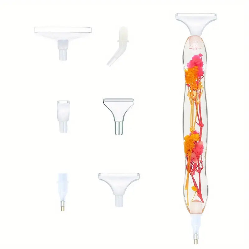 Diamond painting pen with red real flowers in resin, includes 6 plastic tips – perfect for focused DIY creators seeking beauty and precision.