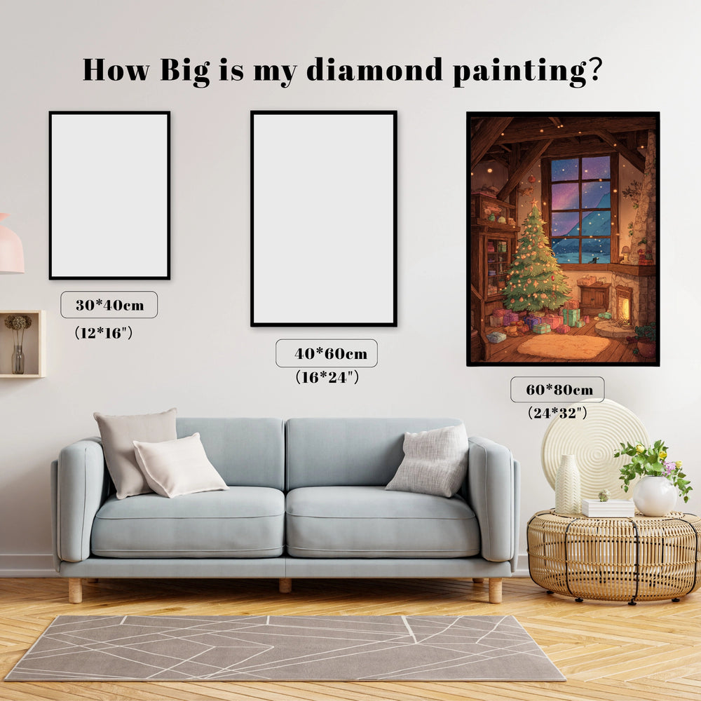 This design captures the ultimate cozy holiday retreat. A beautifully decorated Christmas tree glows warmly beside a stone fireplace, set against a huge window revealing a starlit, snowy mountain night. It evokes pure peace and cabin magic. This intricate project lets you create a masterpiece that celebrates the serene, romantic joy of a winter escape.