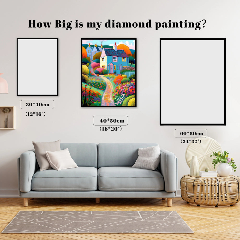 This design is a joyful burst of color and pure magic. The azure blue cottage, trimmed with vibrant pink, sits along a winding, patterned path surrounded by an explosion of expressive flowers. It evokes cheerful serenity and boundless wonder. This delightful project lets you create a masterpiece that captures the magic of a garden path leading straight to your dream home.