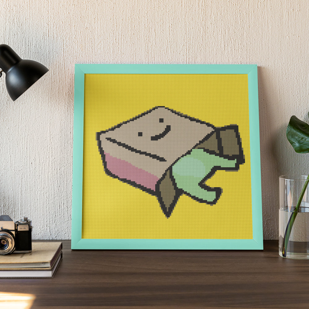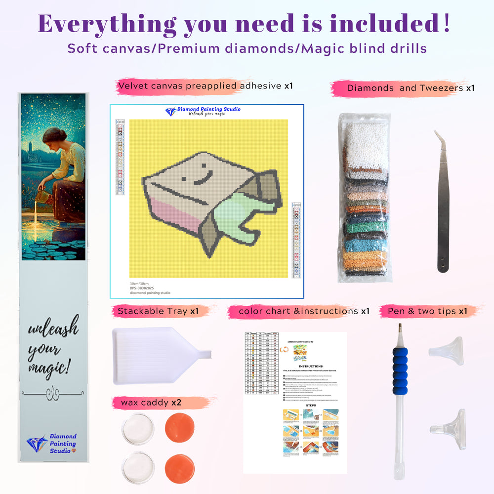 This cute and simple design features a happy green figure peeking out from a cardboard box. The minimalist design, with its childlike simplicity, brings a feeling of joy and innocence. Perfect for adding a cheerful touch to any creative space.