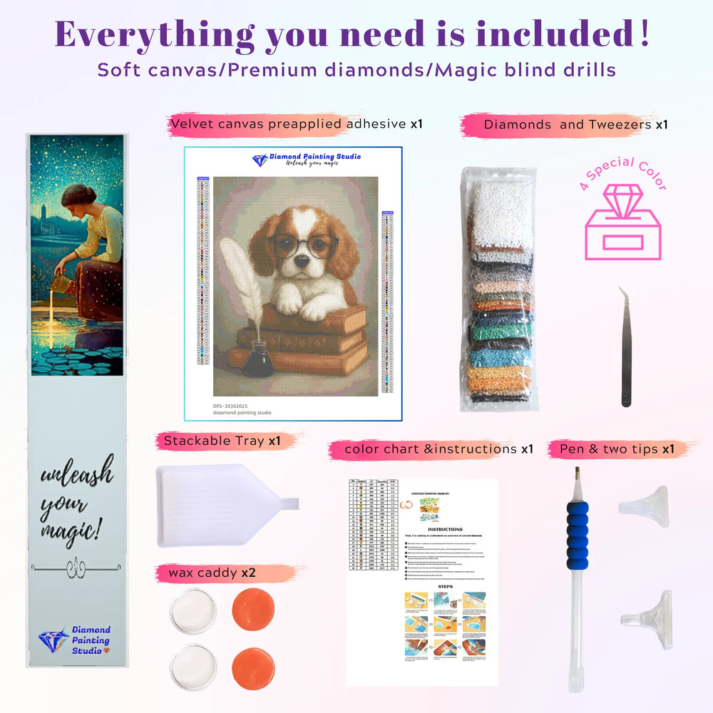 Is it just us, or does this pup look like he’s about to write a novel? This Cavalier King Charles Spaniel perched on a stack of old books—with a quill and ink, no less—is pure charm and cleverness. It’s the kind of diamond painting kit that makes your space feel a little smarter and a whole lot cuter. Perfect for pet lovers, bookworms, or anyone who appreciates a little literary flair in their DIY diamond art.