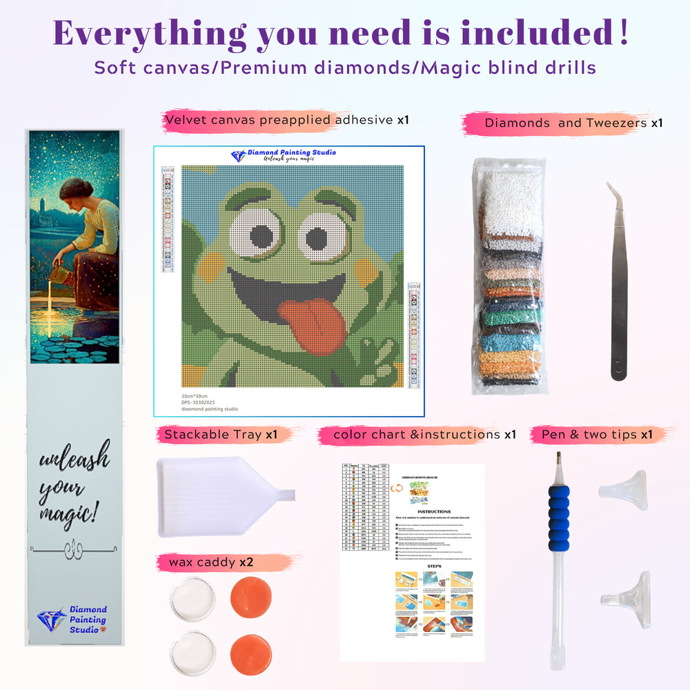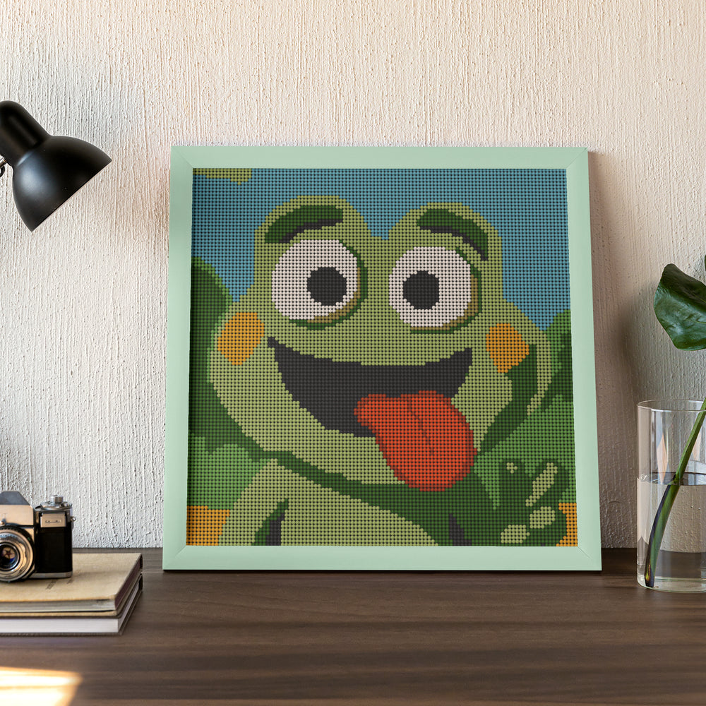 A wide-eyed, green felt frog flashes a playful grin and a peace sign. This charming diamond painting kit transforms its joyful expression into vibrant wall art—perfect for lovers of whimsical decor, nature-inspired DIY crafts, and lighthearted, mood-lifting home accents.