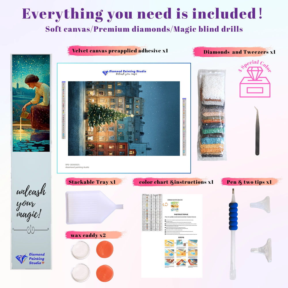 This design captures the heartwarming charm of a European holiday market. A giant, beautifully lit Christmas tree stands proudly in the town square, surrounded by cozy buildings with glowing windows under a starlit sky. It evokes pure peace and festive nostalgia. This intricate project lets you create a masterpiece that celebrates the community and the quiet magic of the holidays.