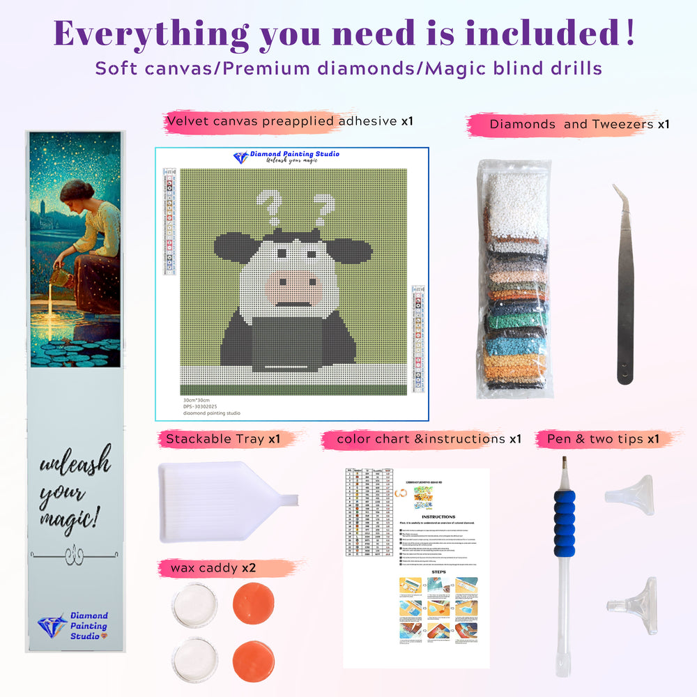 This plush-style cartoon cow, sitting in front of a laptop, perfectly captures that "what am I even doing?" feeling of office life. This is the perfect diamond art kit to give as a gift to a coworker, or to add a touch of humor to your own workspace.