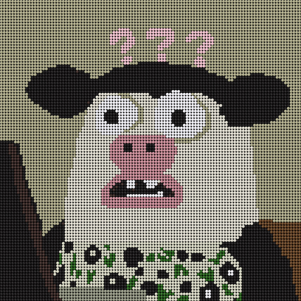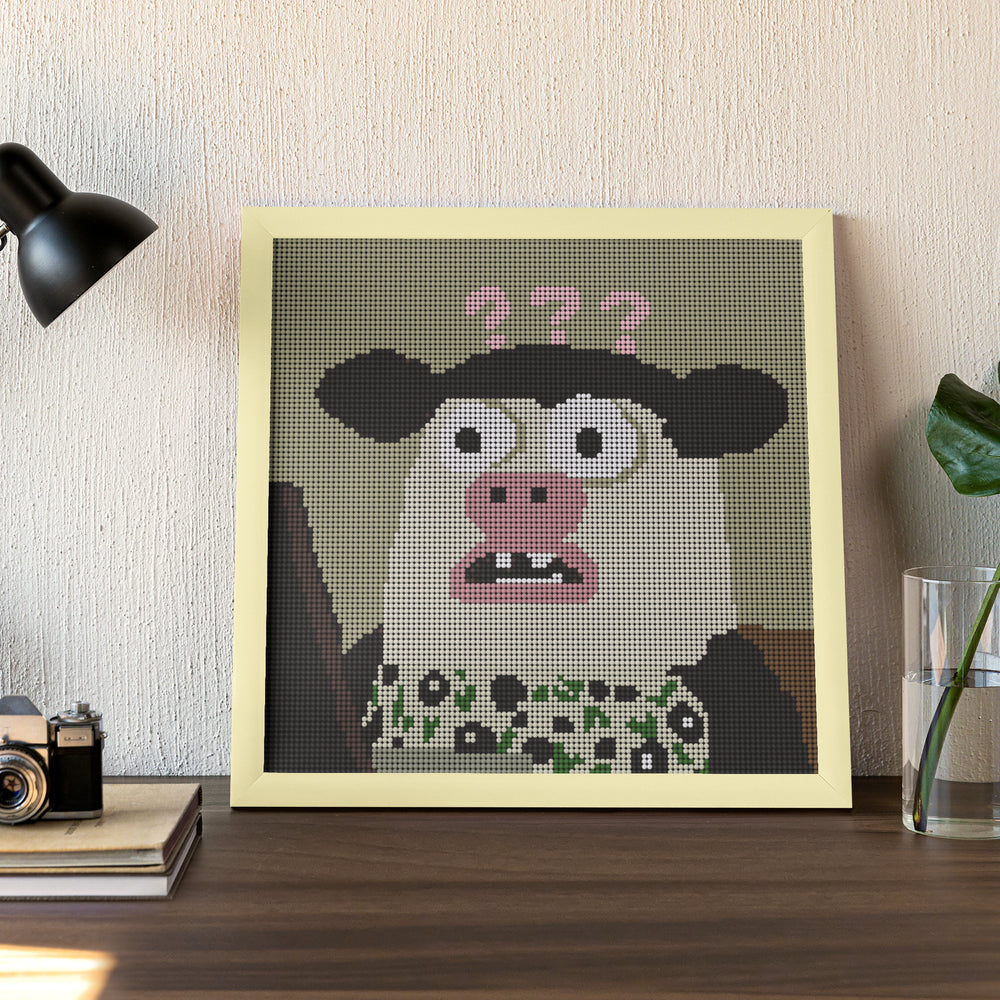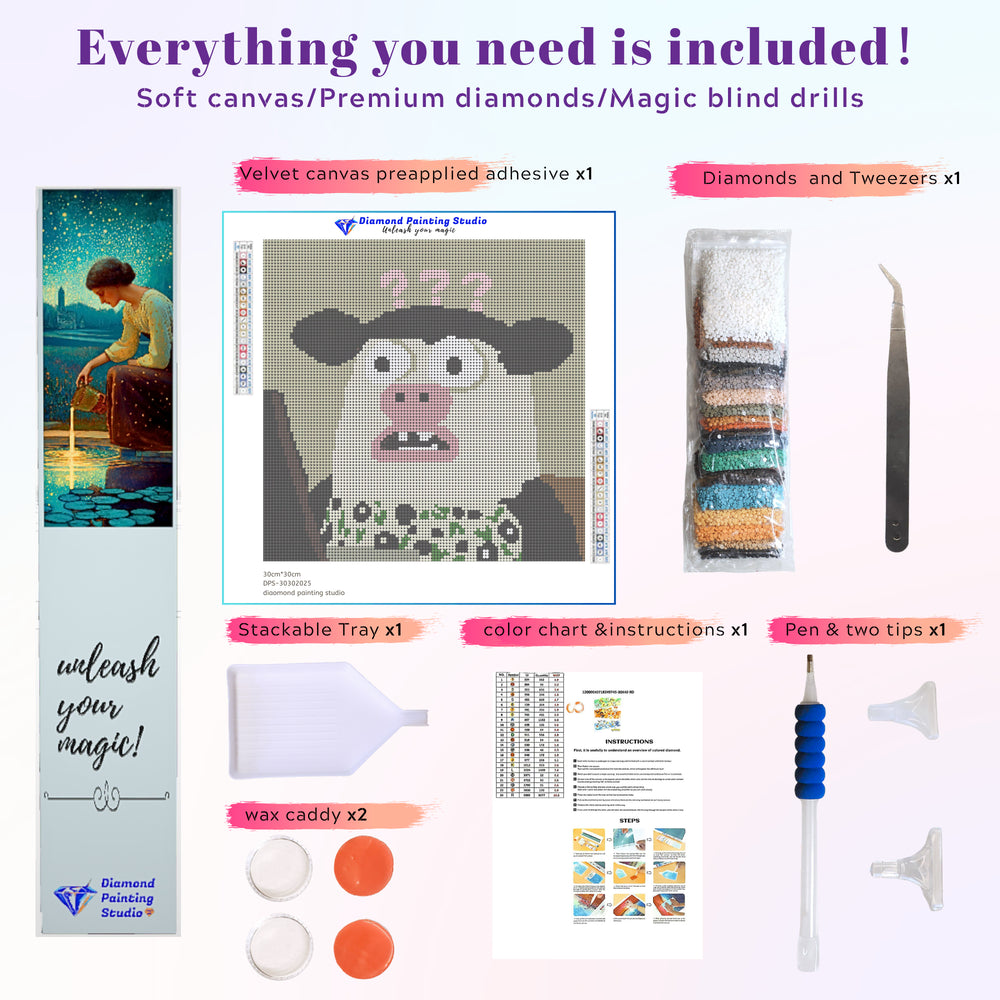 This funny diamond painting kit features a cartoonish cow with wide eyes and floating question marks, capturing a perfect blend of surprise and confusion. This DIY art project humorously reflects the relatable “What just happened?” moment, making it a great home décor piece for anyone who enjoys quirky designs.