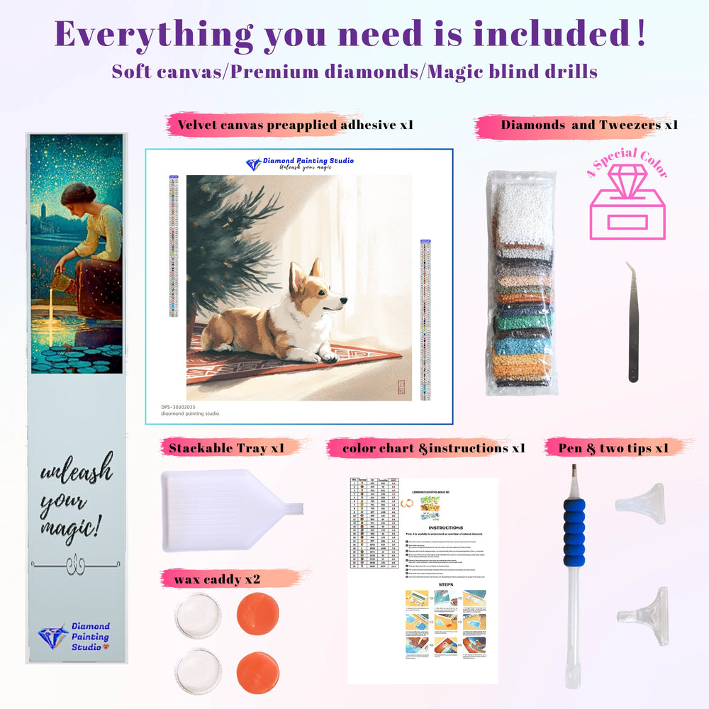 This design captures the heartwarming joy of holiday companionship. A fluffy Corgi rests serenely beside a Christmas tree, basking in the soft winter light. It evokes peace, loyalty, and the cozy magic of home. This delightful project lets you create a masterpiece that celebrates the unconditional love and quiet warmth shared with your best furry friend during the festive season.
