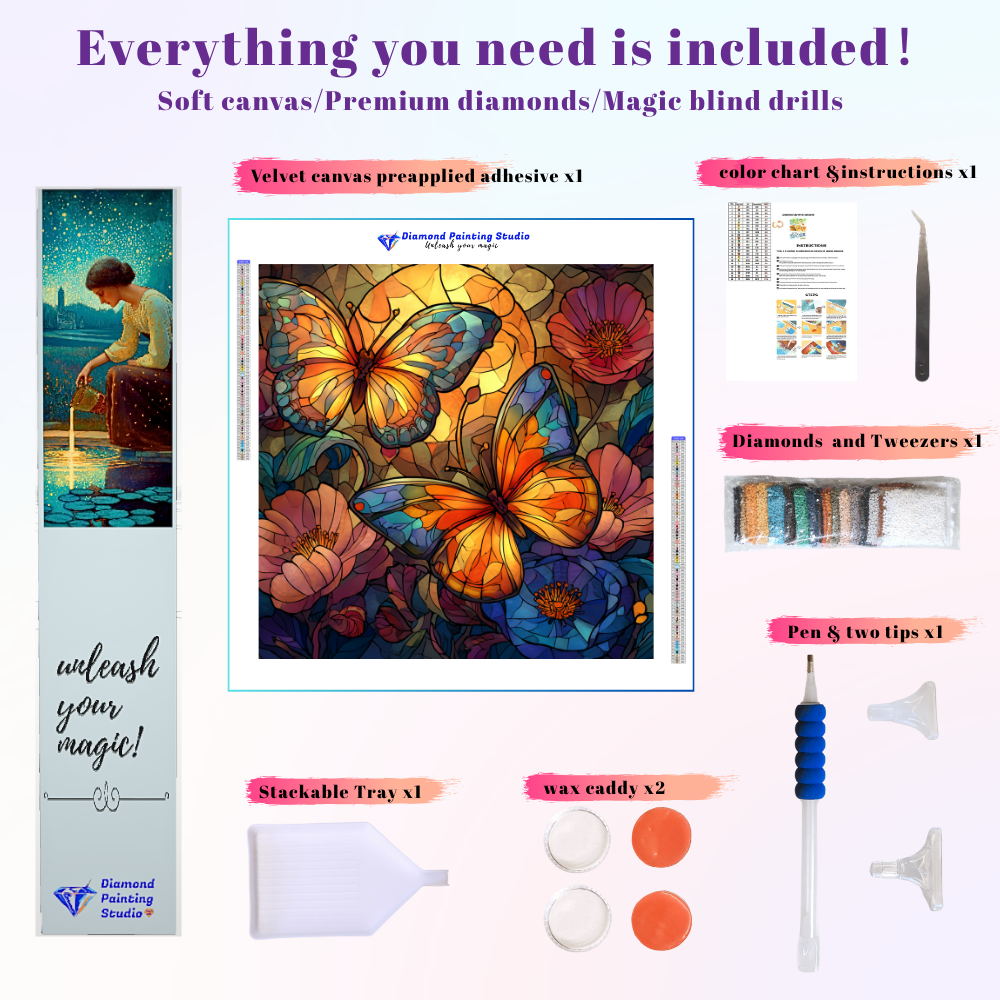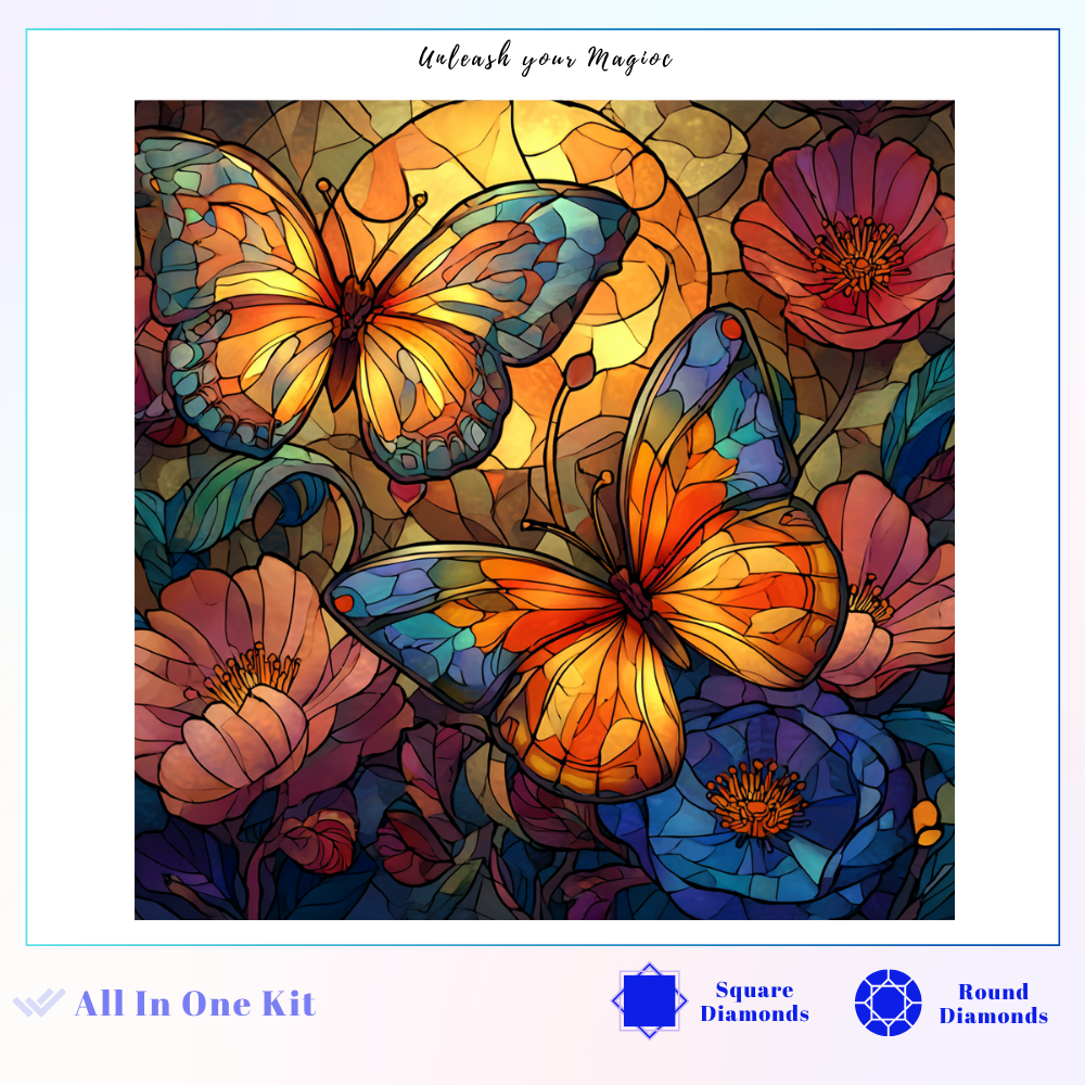 This design is a vibrant celebration of freedom and change. Two brilliant butterflies, symbols of transformation, shimmer above lush flowers, their wings catching the golden light. The entire scene is rendered in breathtaking stained glass. This joyful, therapeutic project invites deep focus, allowing you to create a radiant, jewel-toned talisman of personal growth and natural beauty.