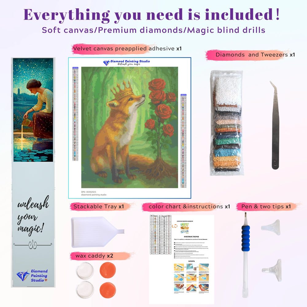 A crowned fox gazes toward thorned roses, emerald woods blurring into dreams. Where untamed beauty meets sovereign wildness, magic sparks—unleash your fierce reverence.