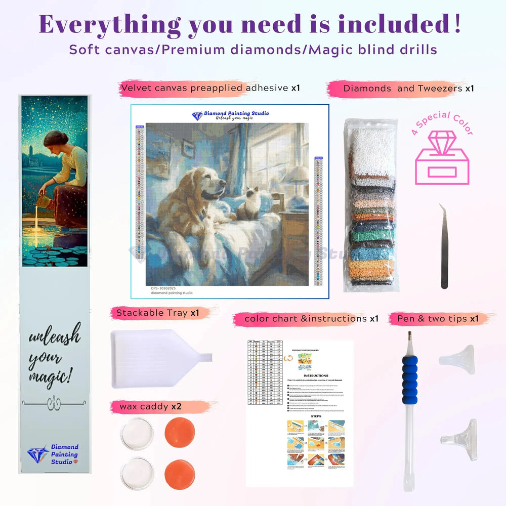 Dive into a world of comfort and calm. This heartwarming diamond painting kit features a golden retriever and a Siamese cat relaxing together in a peaceful bedroom. t’s the perfect project for anyone who loves their pets and wants to add a dose of cozy vibes to their home.