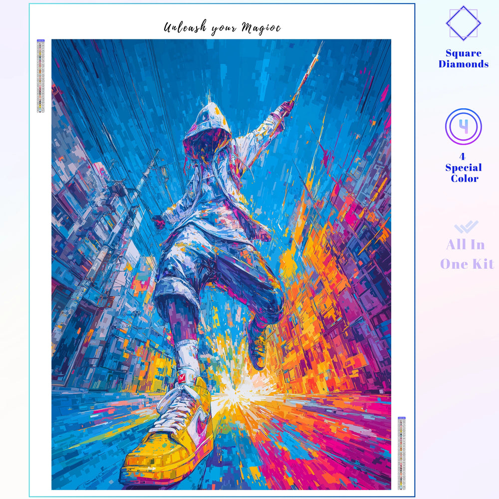 This design is an explosion of urban energy and street style. A dynamic figure leaps mid-air, surrounded by a kaleidoscopic cityscape rendered in vibrant, fragmented brushstrokes. It captures the electrifying thrill of freedom and movement. This high-energy project lets you create a masterpiece that celebrates bold self-expression and modern artistic flair.