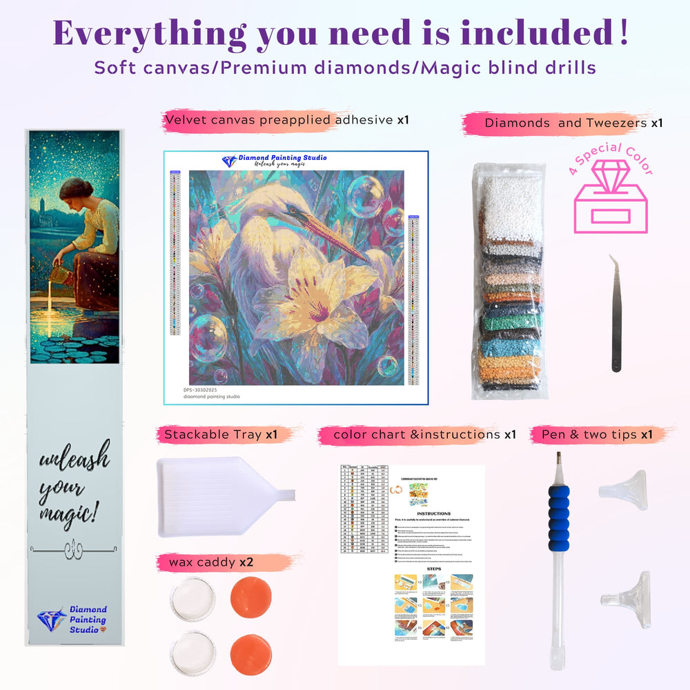 This diamond painting kit features a majestic egret surrounded by stunning rainbow lilies . Just look at its gleaming white feathers!It’s the perfect project for anyone who loves nature and wants to create a truly tranquil masterpiece.