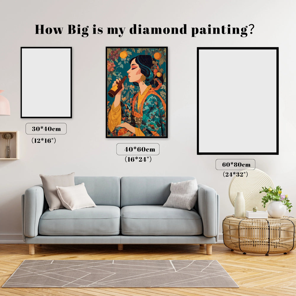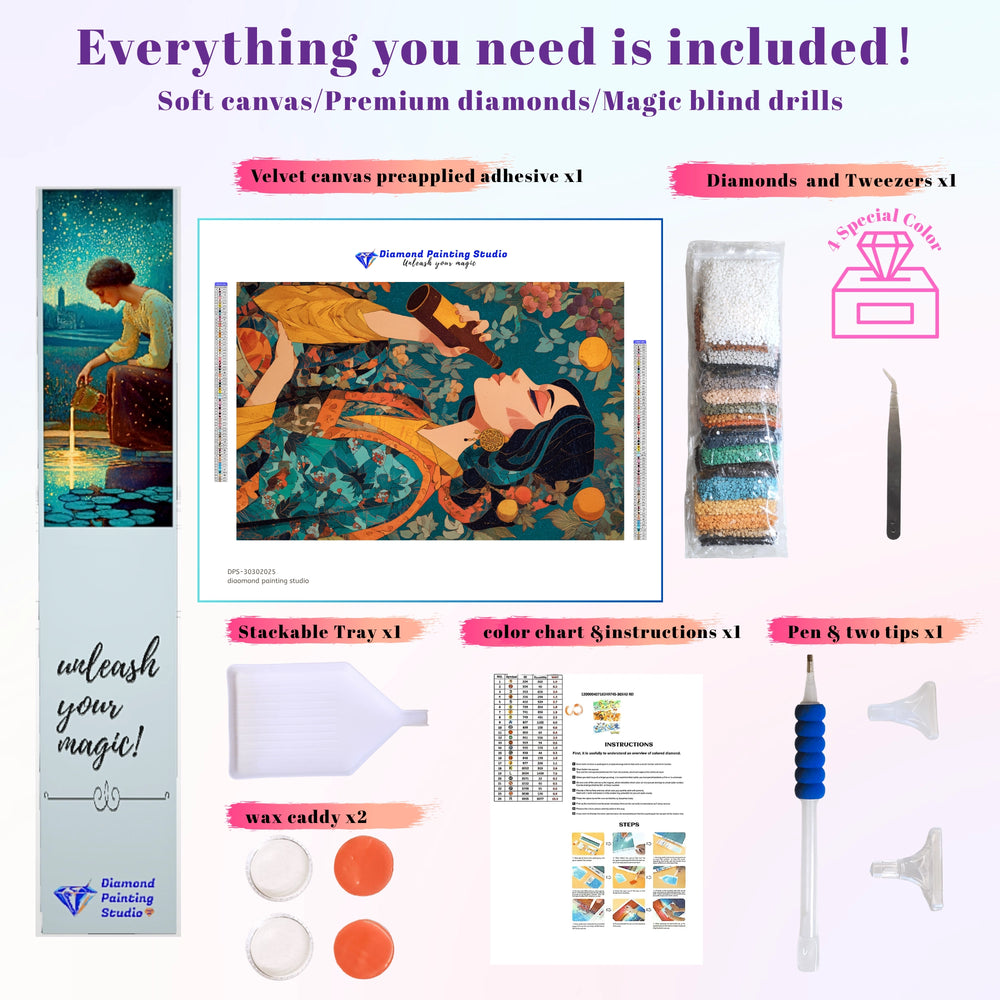 This design is a luxurious celebration of relaxation and self-possession. The elegant woman, dressed in a stunning, patterned kimono, takes a private moment of refreshment surrounded by lush fruit and foliage. The bold teal and orange colors evoke serenity and vitality. This intricate project lets you create a masterpiece that captures quiet luxury and confident grace.