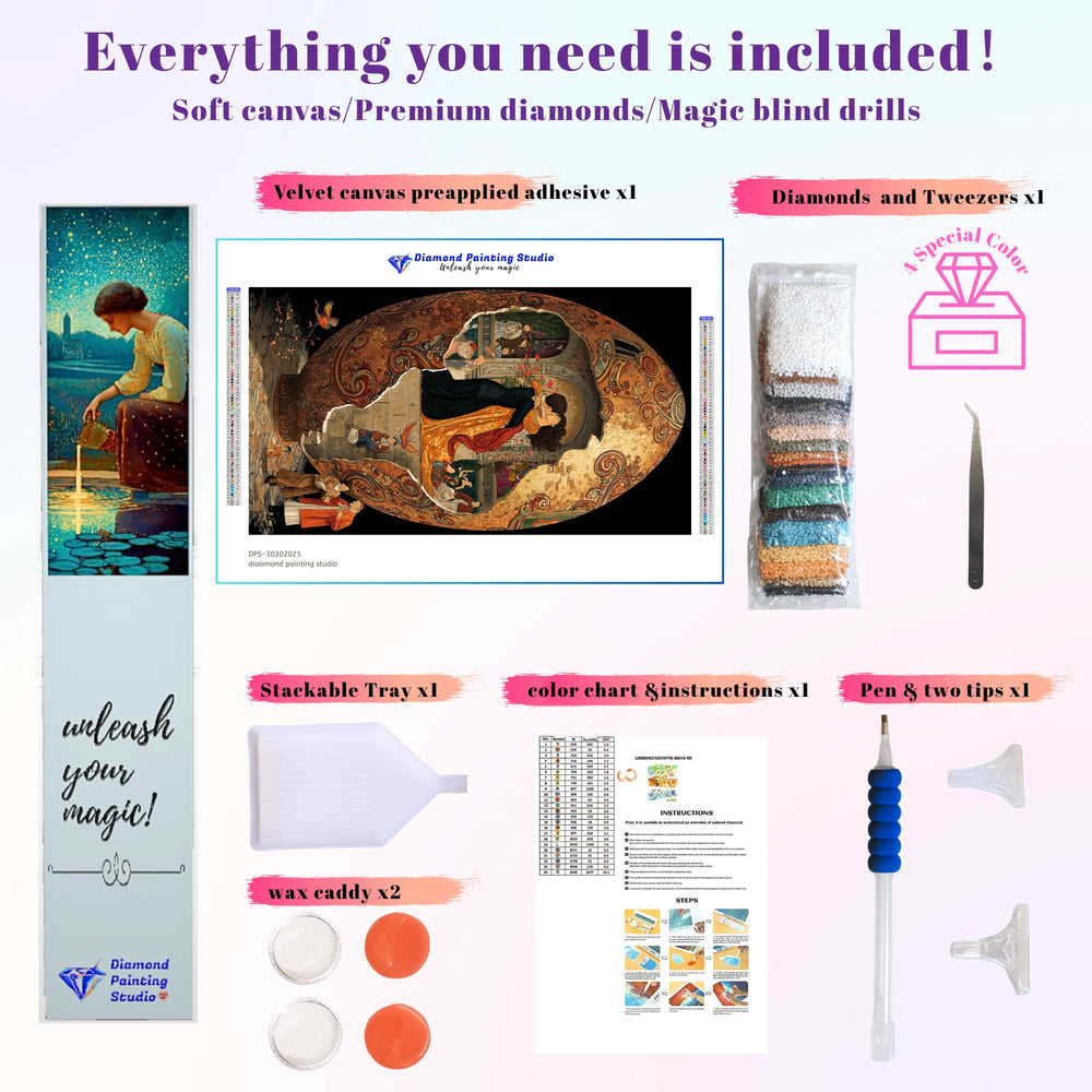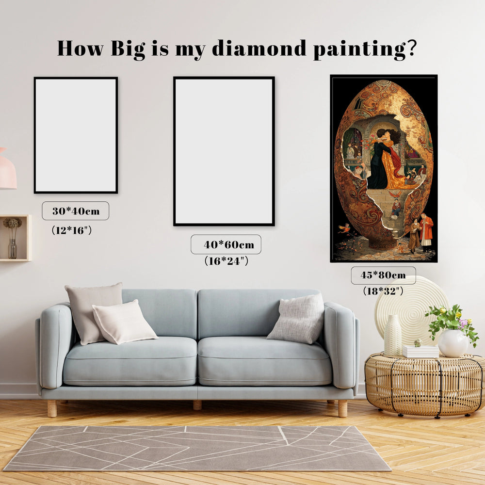 This design is a stunning, symbolic celebration of love and new beginnings. The scene of a passionate, classic romance is revealed within a fractured Faberge Egg, symbolizing life's precious moments breaking free. The intricate detail and warm colors evoke deep emotion and mystery. This complex project lets you create a masterpiece that captures the magic of true connection.