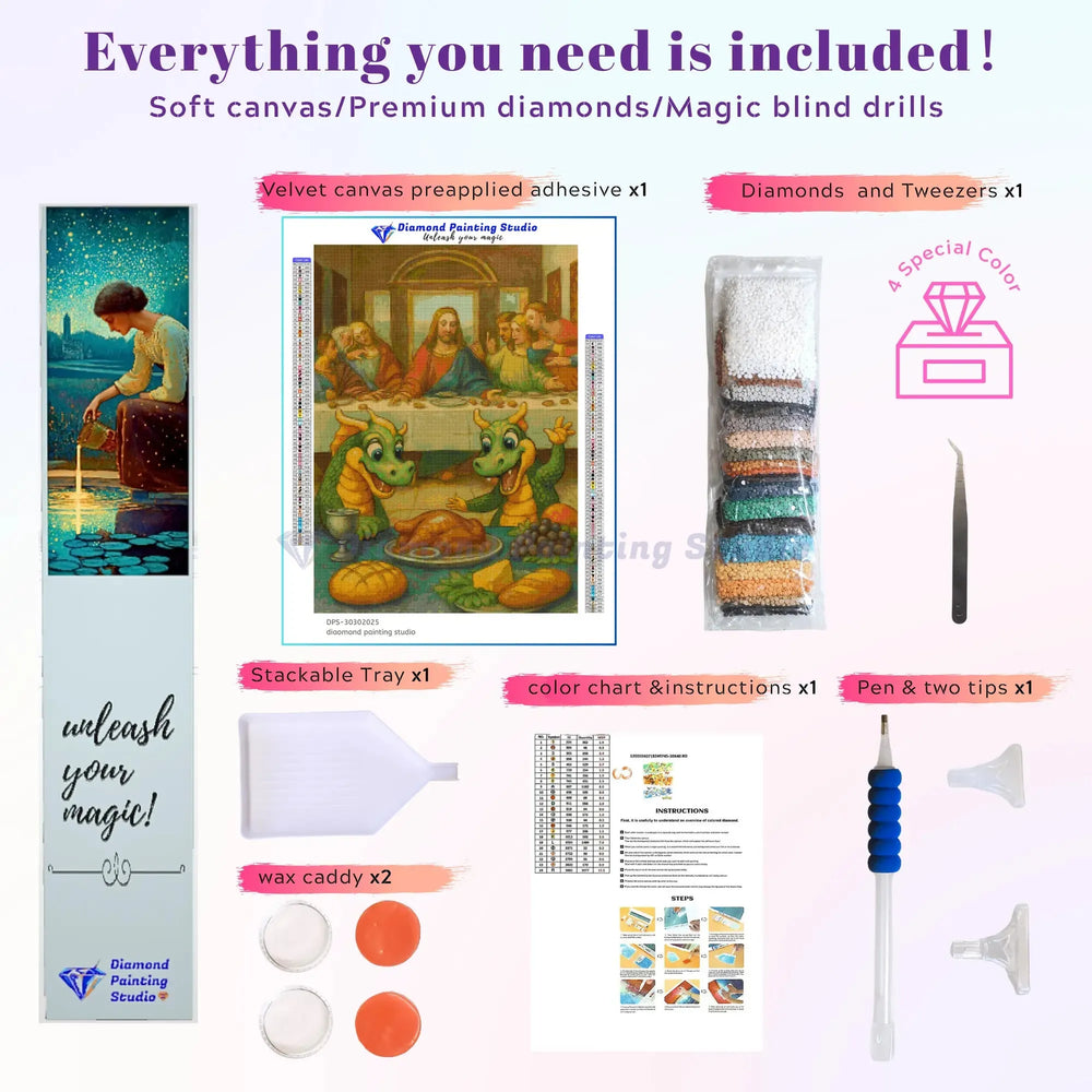 You have to see this! This diamond painting kit is a wild take on a famous painting. Imagine a sacred feast... but with a bunch of cute, hungry dragons instead of apostles! It's a fantastic blend of fantasy and classic art. This is a must-have for anyone who wants a unique and unforgettable piece of art that’s sure to get a few laughs.