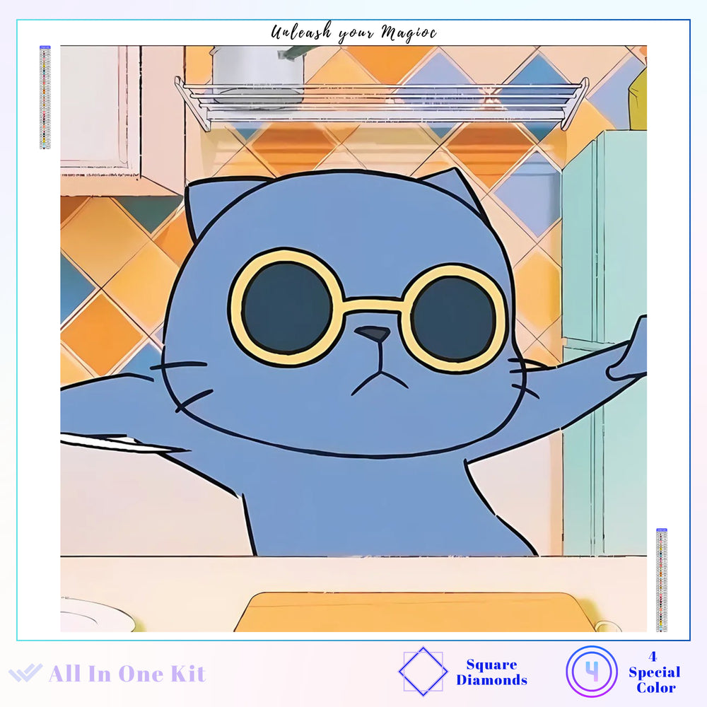 This sassy blue cat is rocking round shades like it’s nobody’s business and probably just burnt a soufflé—but with style.