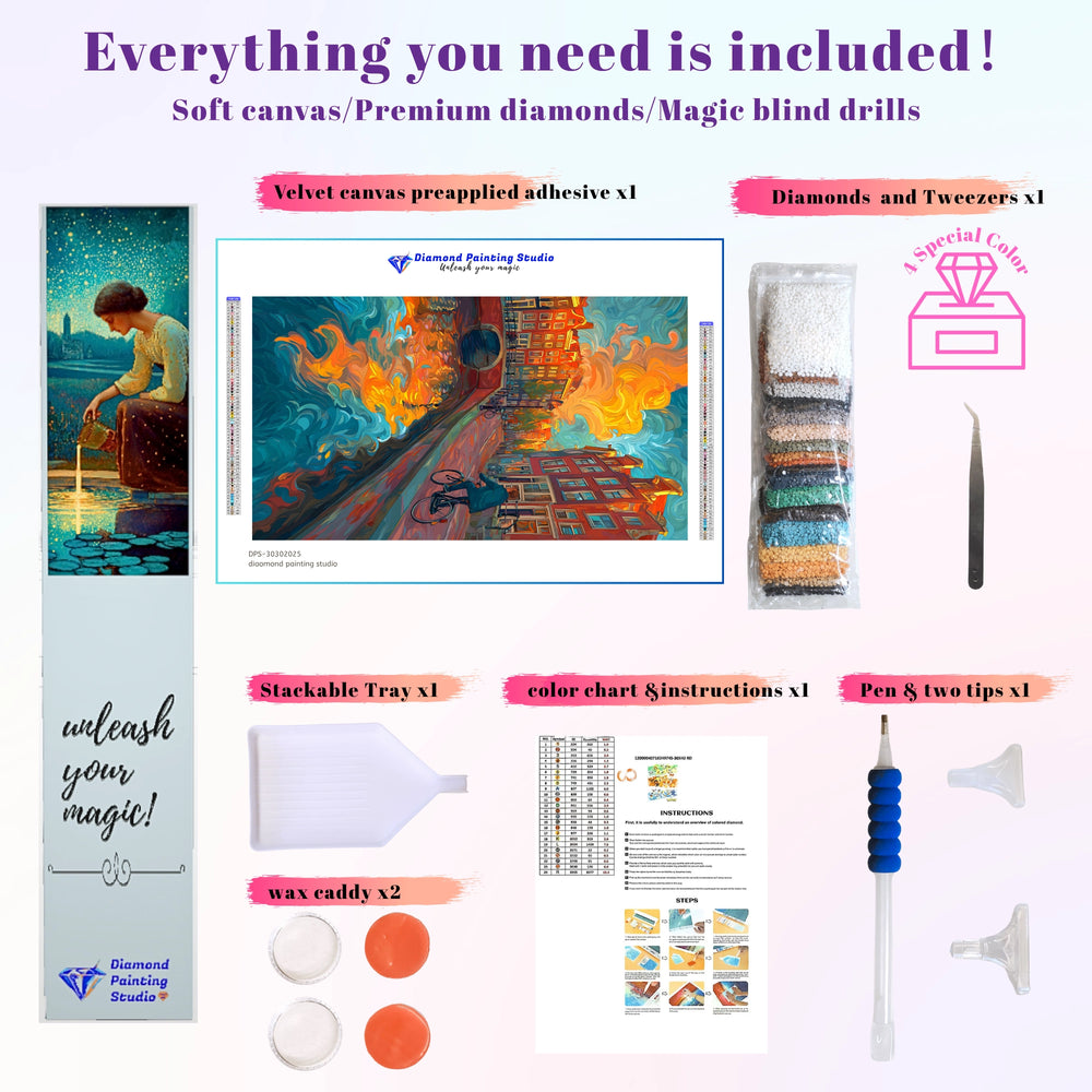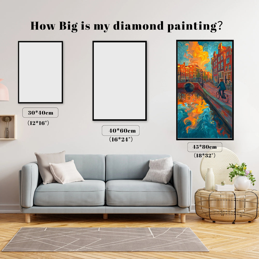 This design is a breathtaking rush of color and motion. A cyclist rides along a historic canal, where the fiery sunset and buildings are wildly reflected in the swirling water. The thick, expressive impasto texture captures intense urban energy. This captivating project lets you create a masterpiece that embodies the adventurous spirit of European city life.