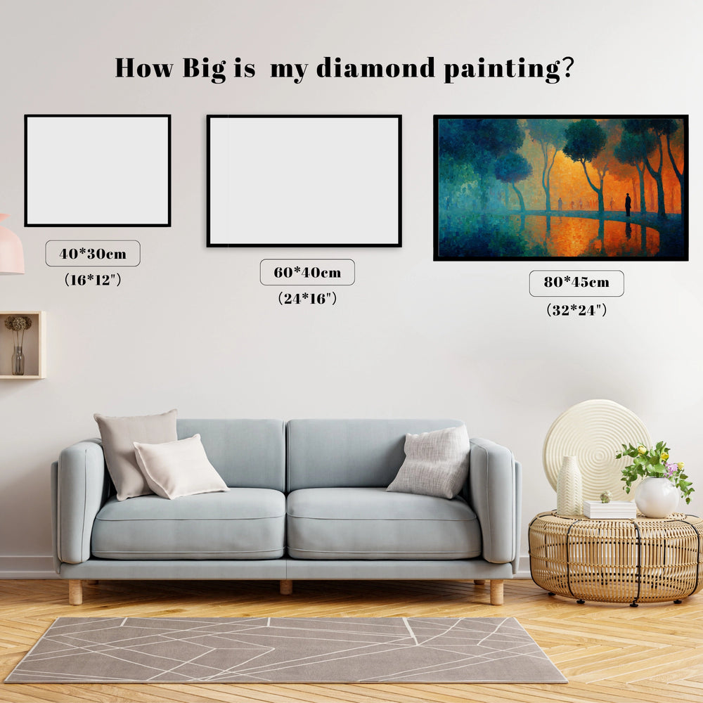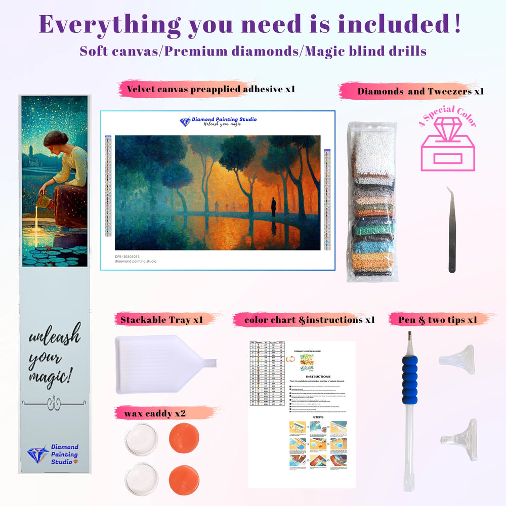 This design is a mesmerizing study in light and shadow. Tall, dark trees frame a path where warm orange light meets cool, deep blue water, all rendered in thick, emotional brushstrokes. It captures the mysterious beauty of twilight. This immersive project lets you create a masterpiece that symbolizes the journey toward light and finding profound calm in contemplation.