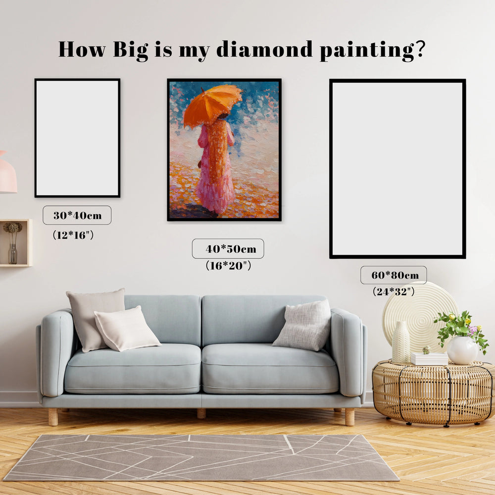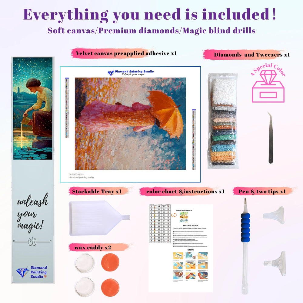 This design is a vivid celebration of elegance and solitude. The figure, draped in pink and orange, walks beneath a bright orange umbrella, all rendered in expressive, thick impasto brushstrokes. It captures a moment of graceful, quiet contemplation. This immersive project lets you create a masterpiece that embodies the beauty of finding serenity in a personal moment.