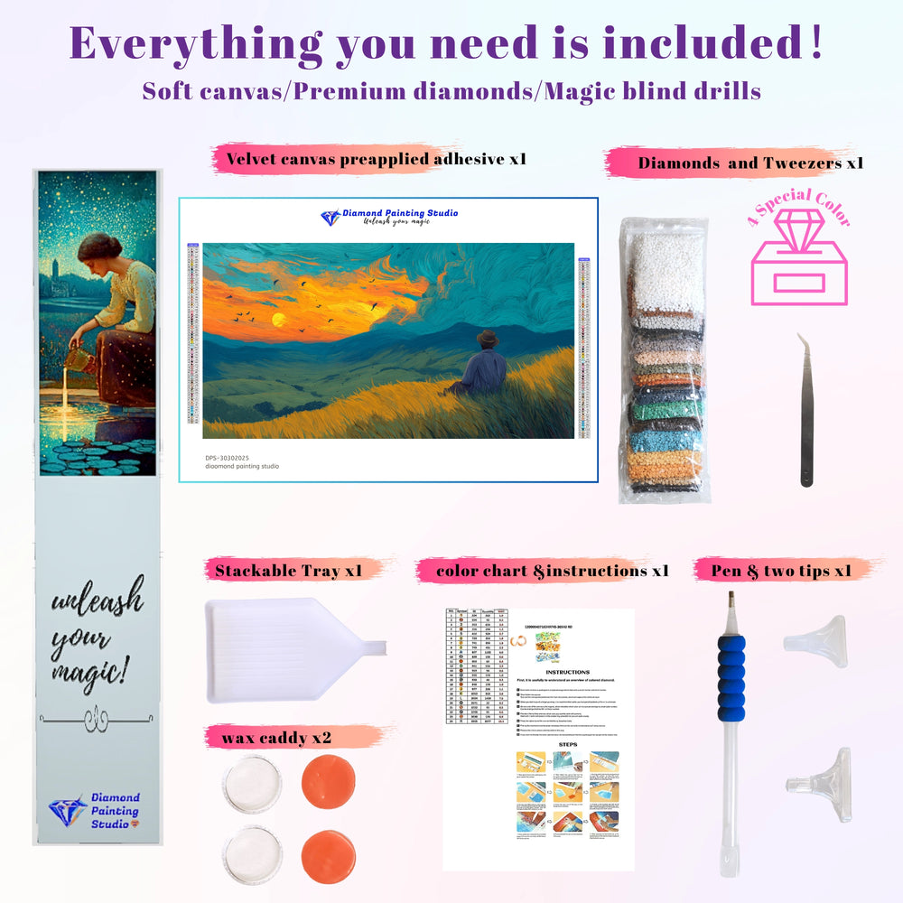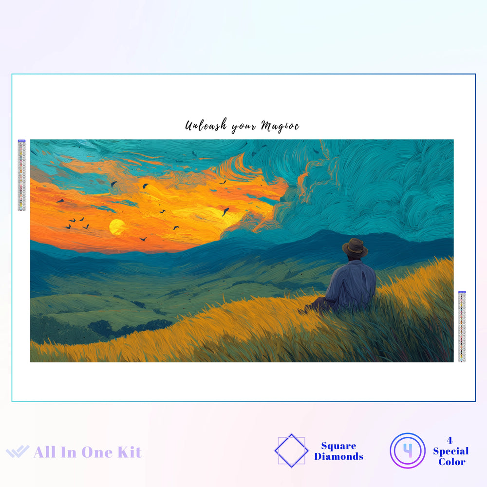 This design is a powerful vision of solitude and reflection. A lone figure sits on a grassy hill, gazing at a dramatic sunset where fiery orange clashes with swirling turquoise clouds. The entire scene is rendered in rich, textured impasto strokes. This immersive project lets you create a masterpiece that captures the expansive beauty of nature and the magic of a quiet, peaceful moment.
