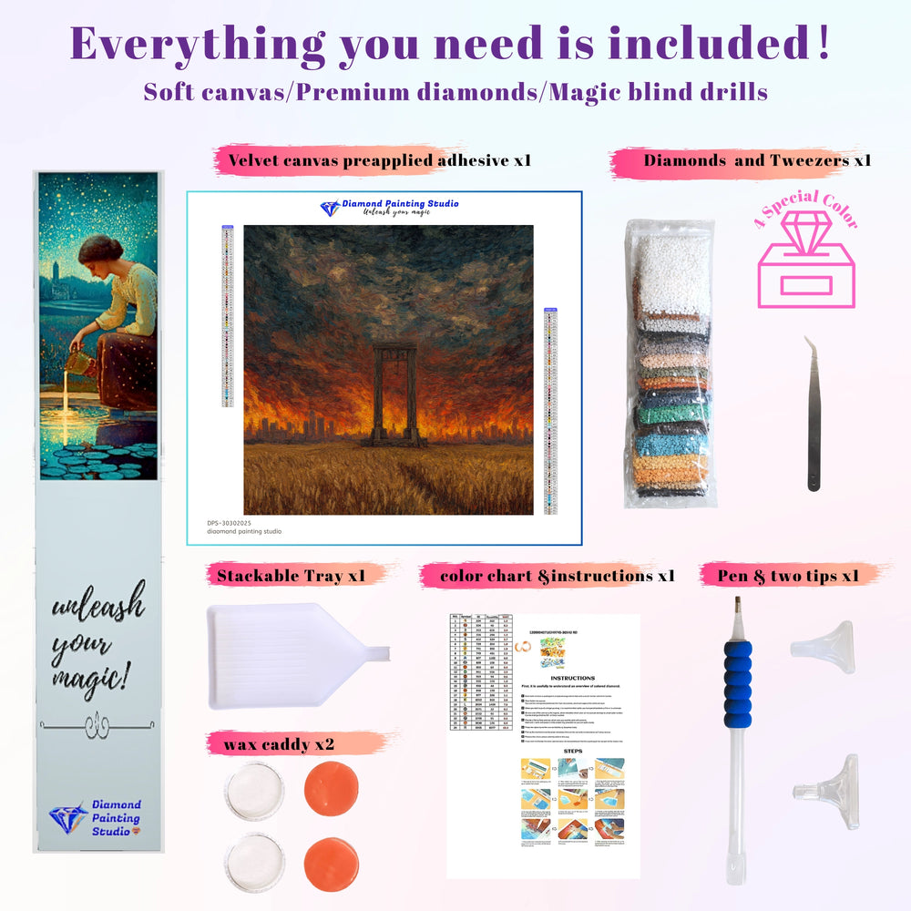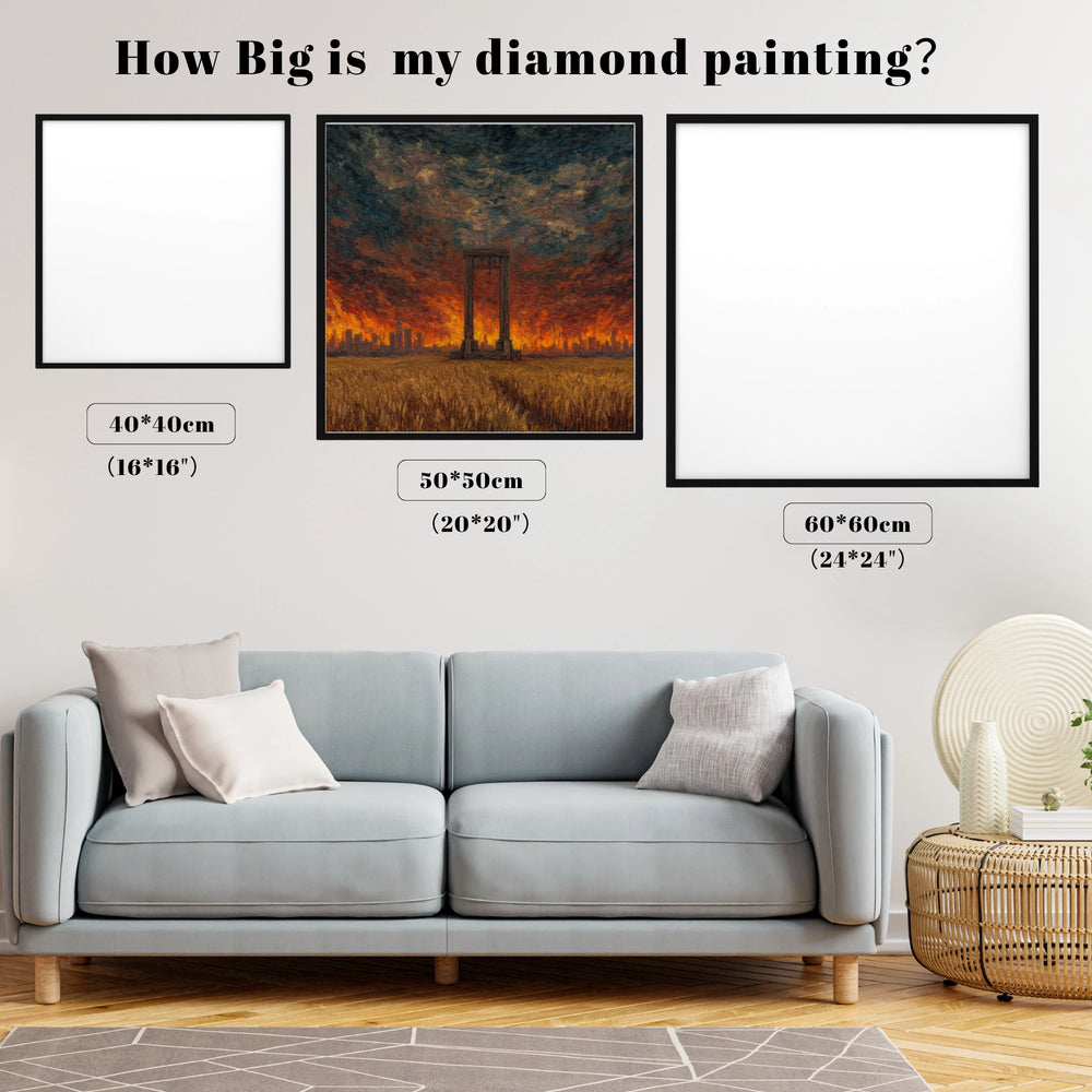 This design is a dramatic statement on change and resilience. The monumental structure stands against a fiery, textured sky and a distant city, symbolizing the crossroads of civilization and nature. The impasto style captures intense emotion and movement. This powerful project lets you create a masterpiece that explores profound themes of rebirth and finding strength amidst chaos.