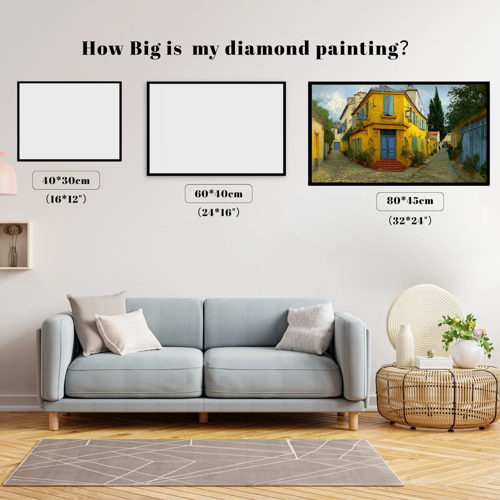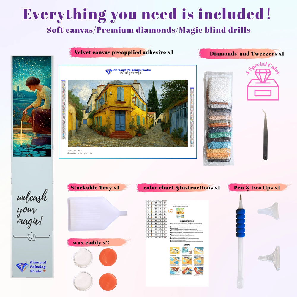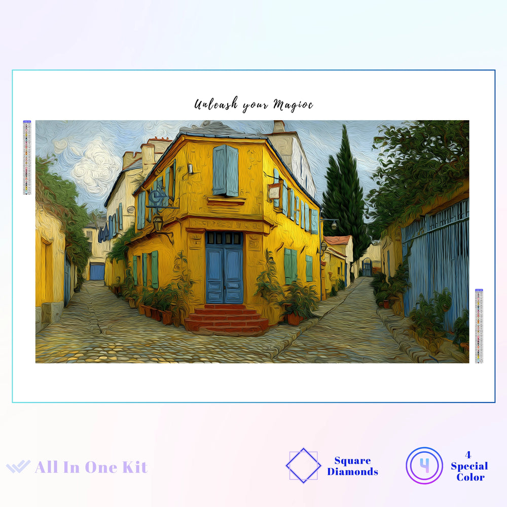 This design is a slice of sun-drenched European charm. The iconic yellow cafe stands welcomingly at the intersection of two cobbled alleys, painted in thick, vivid impasto texture. The contrasting blues and greens evoke a moment of quiet, idyllic travel. This therapeutic project lets you create a masterpiece that captures the nostalgic warmth of a hidden village gem.