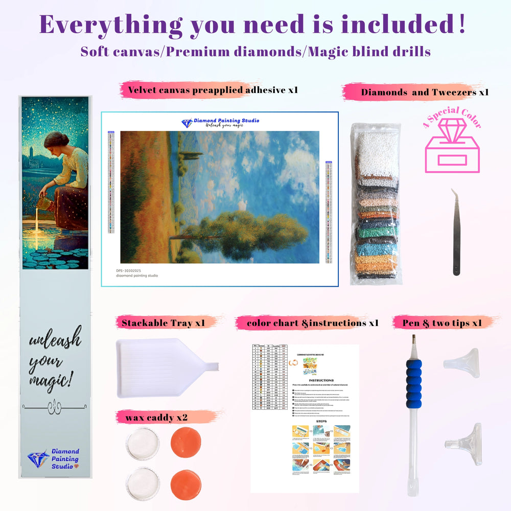 This design is a stunning portrait of open air and light. The solitary, towering tree stands guard over a serene river and sun-drenched field, all rendered in soft, classic Impressionist brushstrokes. The bright blue sky and fluffy clouds evoke tranquility and freedom. This immersive project lets you create a masterpiece that captures the expansive, healing power of nature.