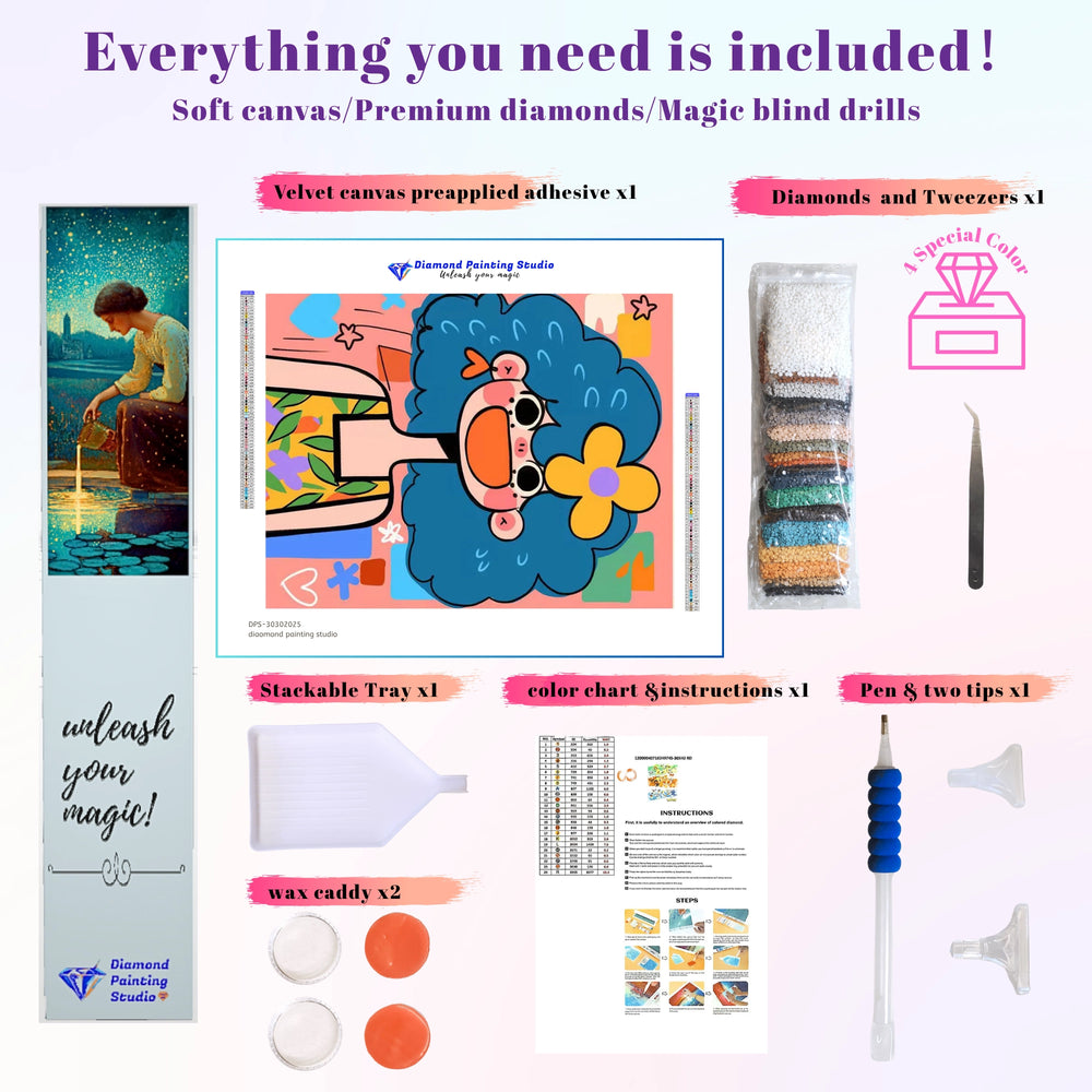 This design is an explosion of pure, unbridled happiness! The smiling girl with vibrant blue hair and a large flower embodies playful joy and innocence. The bold colors and simple lines create an instantly cheerful Pop Art feel. This quick, delightful project lets you create a masterpiece that celebrates the magic of finding joy in simple, colorful moments.