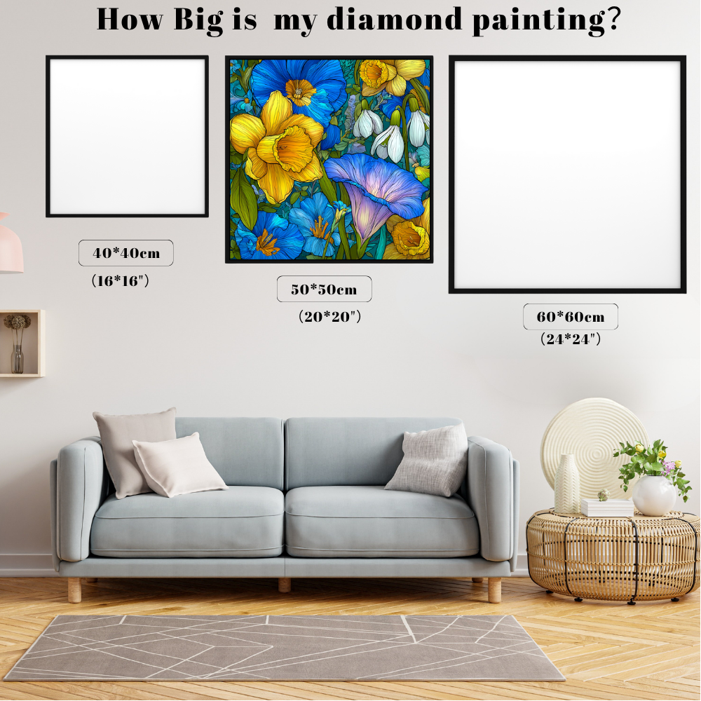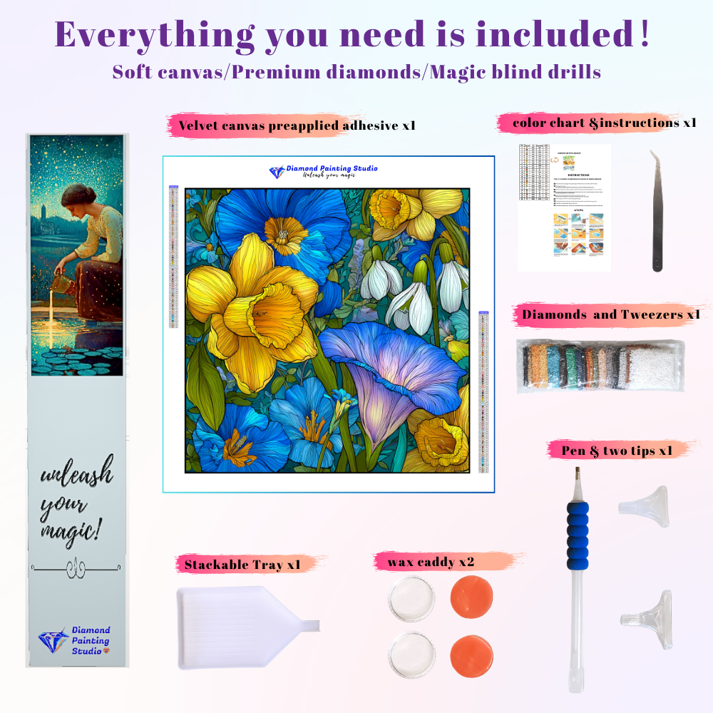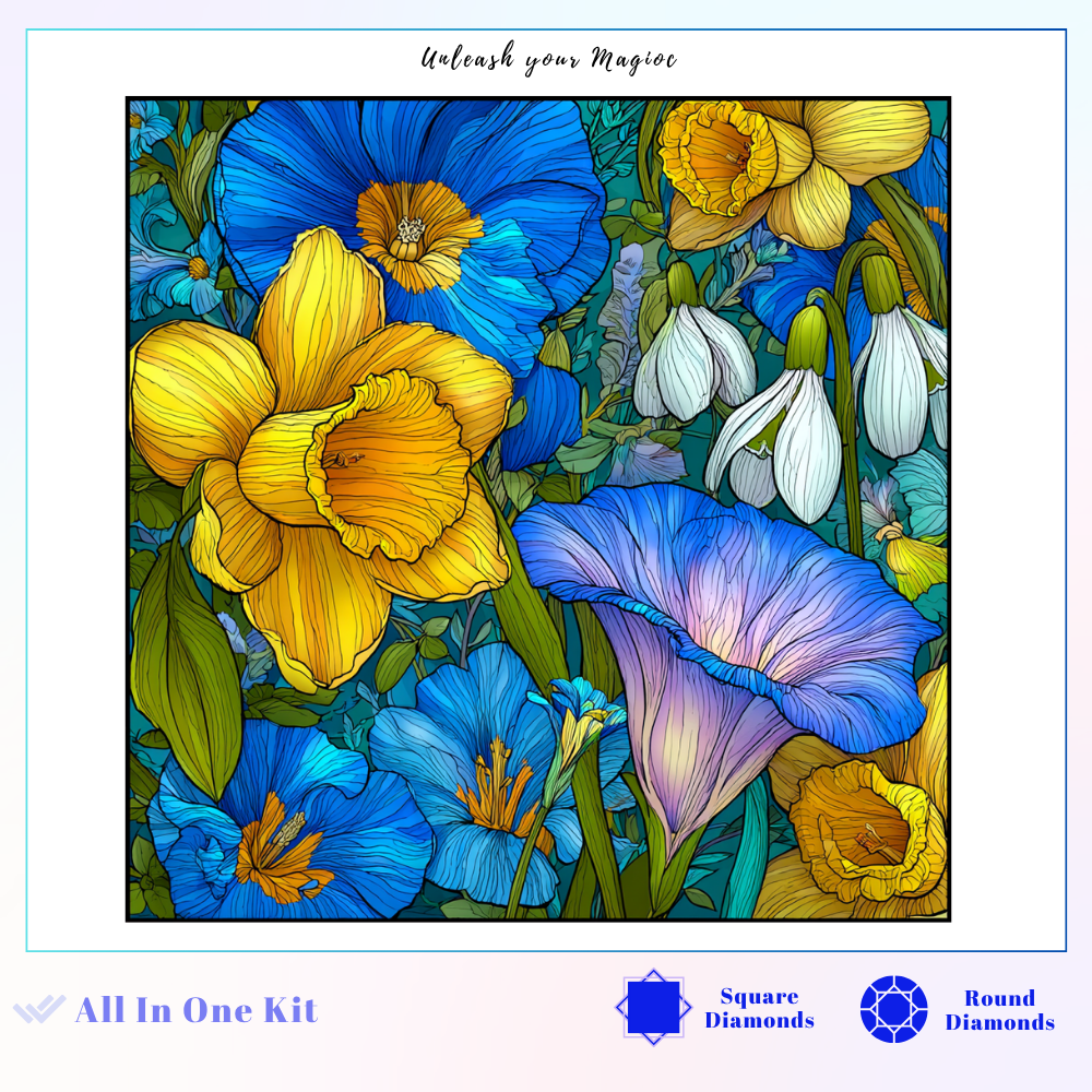 The deliberate juxtaposition of Vibrant Yellows (Daffodils) and deep Tranquil Blues (Morning Glories/Poppies) is a core therapeutic element: