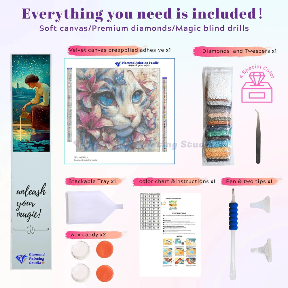 This one is seriously stunning! Just look at those eyes—they feel like they're looking right at you. This diamond painting kit features a gorgeous cat, all framed by a whimsical world of pink flowers and colorful butterflies. It’s an enchanting piece that’s a perfect addition to your DIY art collection!