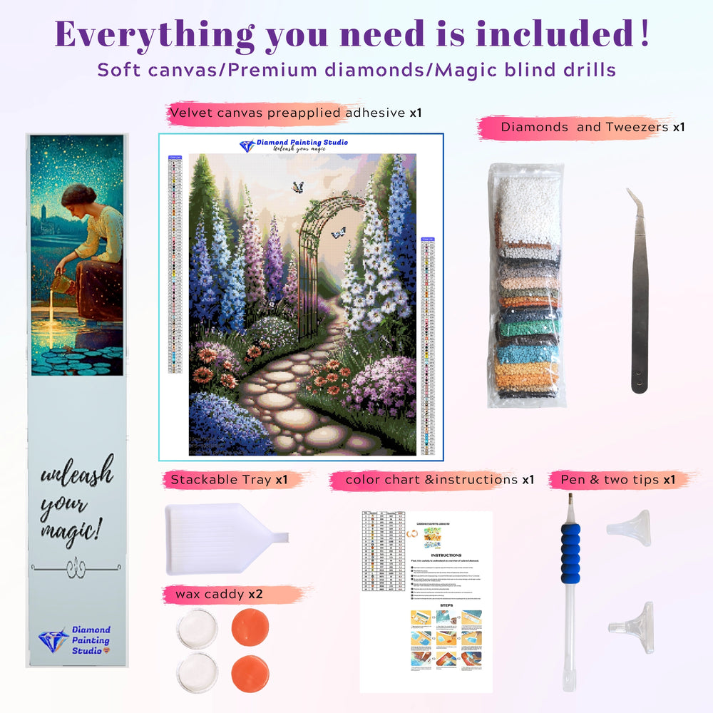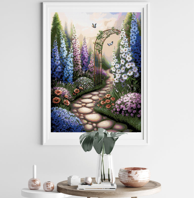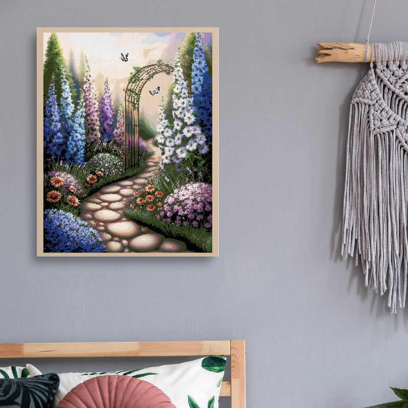 Fantasy garden illustration with arched ivy, colorful flowers, and a winding stone path, designed for square 50x60cm DIY diamond painting lovers.