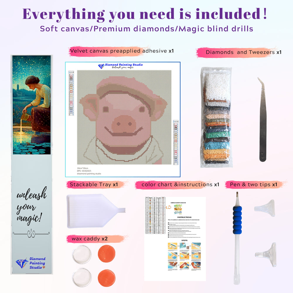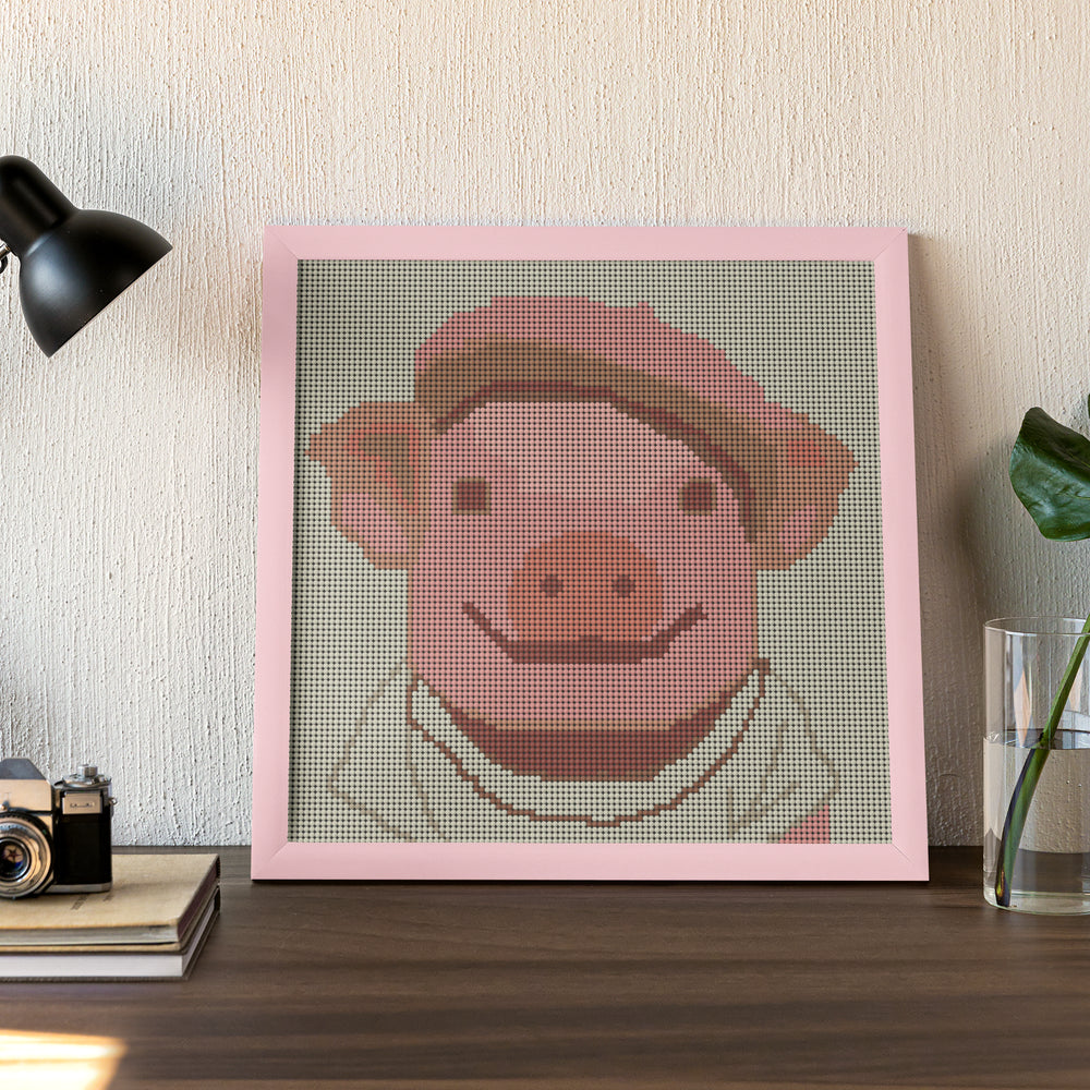 This adorable pink piglet diamond painting kit wears a stylish pastel beret and a crisp white tee. Its sweet smile and bright eyes bring a sense of warmth, making it a delightful DIY décor piece or gift for animal lovers. It's a perfect craft project for brightening any space with a touch of cuteness.