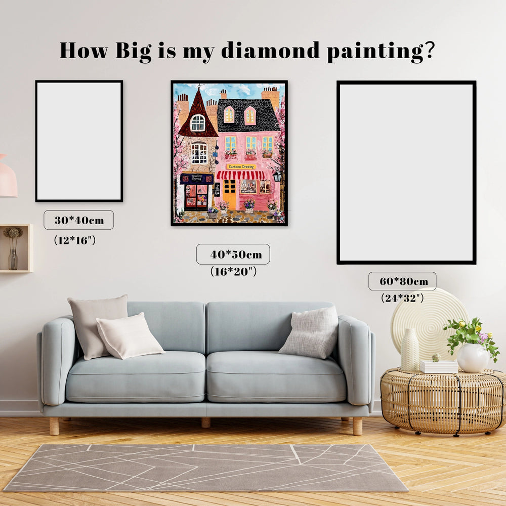 This design is a charming celebration of creative joy. The cheerful pink storefront and stone facade are nestled among blooming cherry blossoms, evoking the warmth of a sunlit spring day. The scene is filled with whimsy and artistic inspiration. This delightful project lets you create a masterpiece that captures the pure joy of simple pleasures and the comforting magic of a welcoming artistic sanctuary.