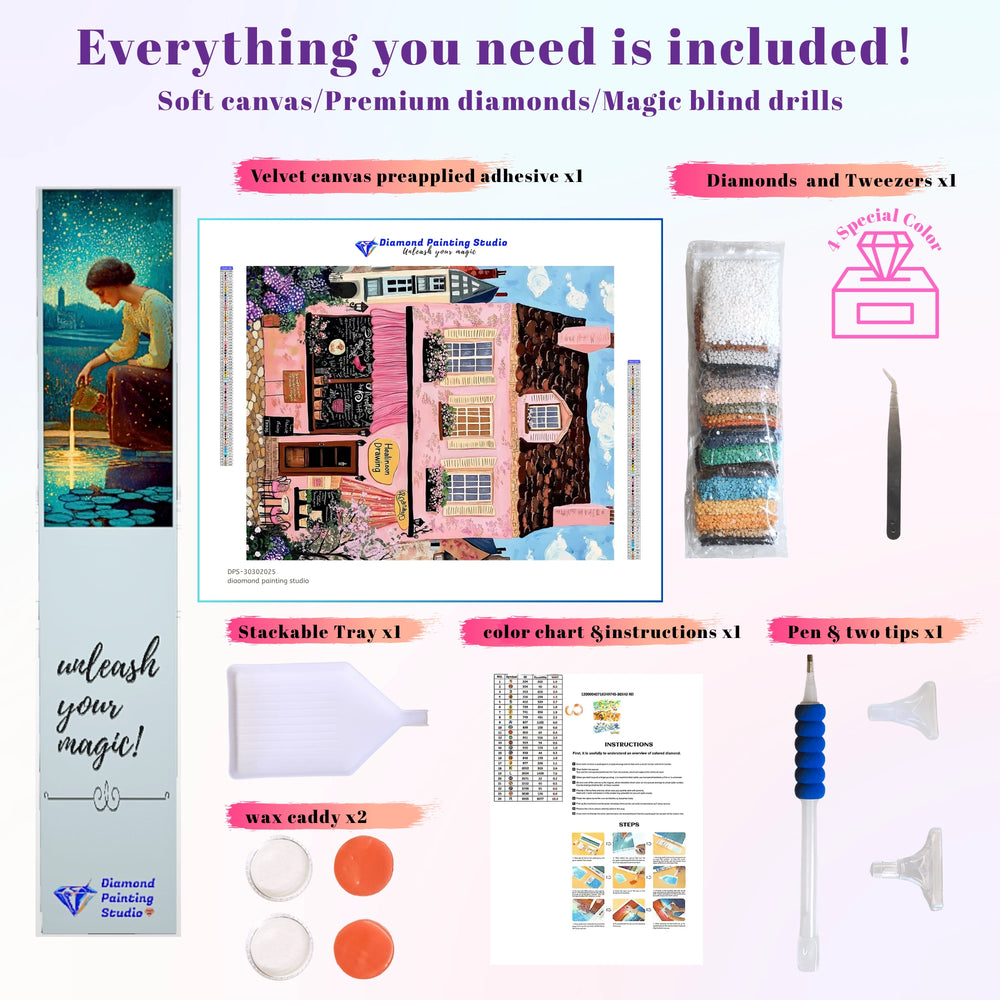 This design is a charming invitation to creativity and self-care. The pink-painted building houses a cozy cafe and drawing studio, framed by blooming flowers and a sunny sky. It evokes whimsical comfort and artistic tranquility. This delightful project lets you create a masterpiece that captures the pure joy of simple pleasures and the magic of a warm, welcoming space.