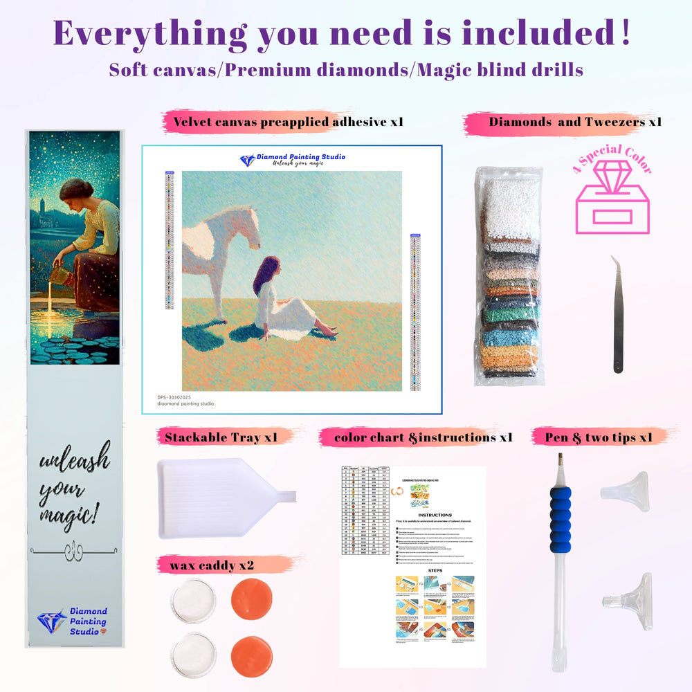 This design is a peaceful ode to quiet connection. A woman in white sits gracefully beside a magnificent white horse, all rendered in delicate pointillist dots of color. The soft, textured landscape evokes calm and devotion. This therapeutic project lets you create a masterpiece that captures the pure bond between human and animal, celebrating serene companionship.