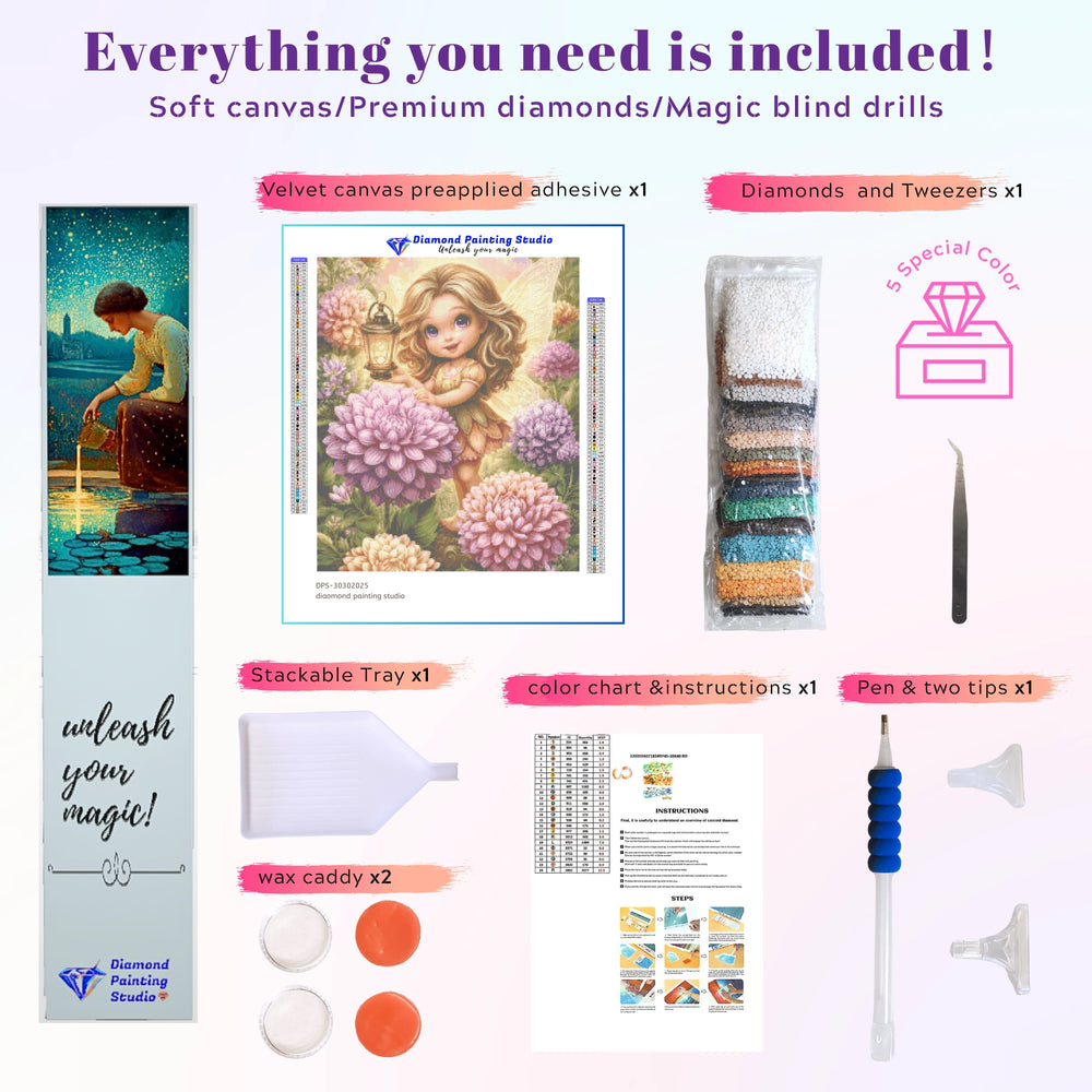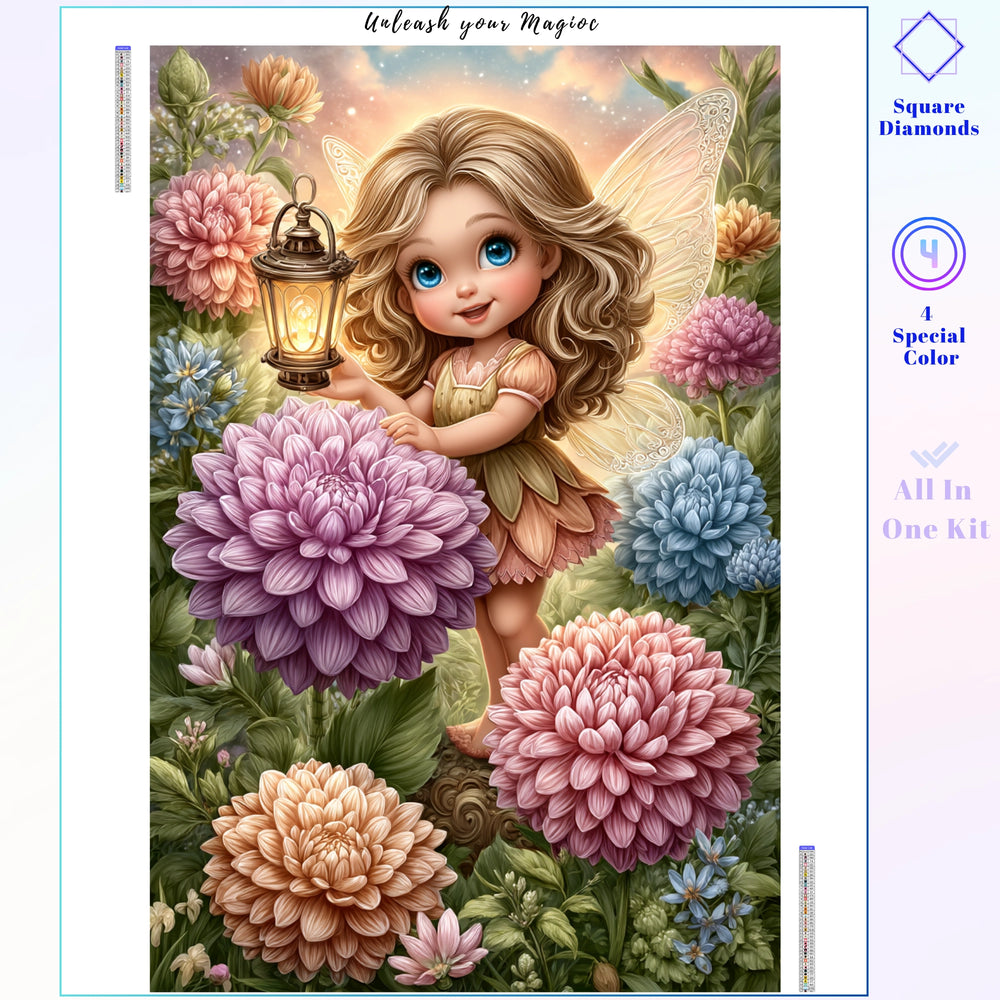 This diamond painting kit features a delightful fairy surrounded by blooming flowers. The fairy, with her sparkling wings and glowing lantern, radiates a sense of wonder and magic. The vibrant flowers, ranging from soft pinks to blues and oranges, form a beautiful backdrop, creating a dreamy and whimsical scene.