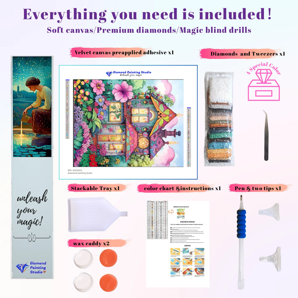 This design is an explosion of pure joy and imaginative color. The whimsical cottage, painted in vibrant teal and pink, is almost hidden by a fantastical garden of oversized flowers and swirling colors. It evokes boundless fantasy and cheerful energy. This complex project lets you create a masterpiece that captures the magic and unbridled creativity of a daydream.