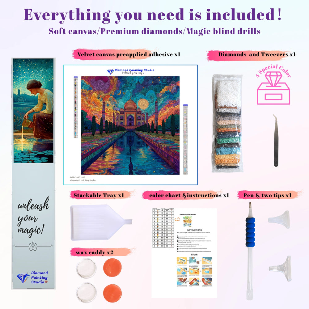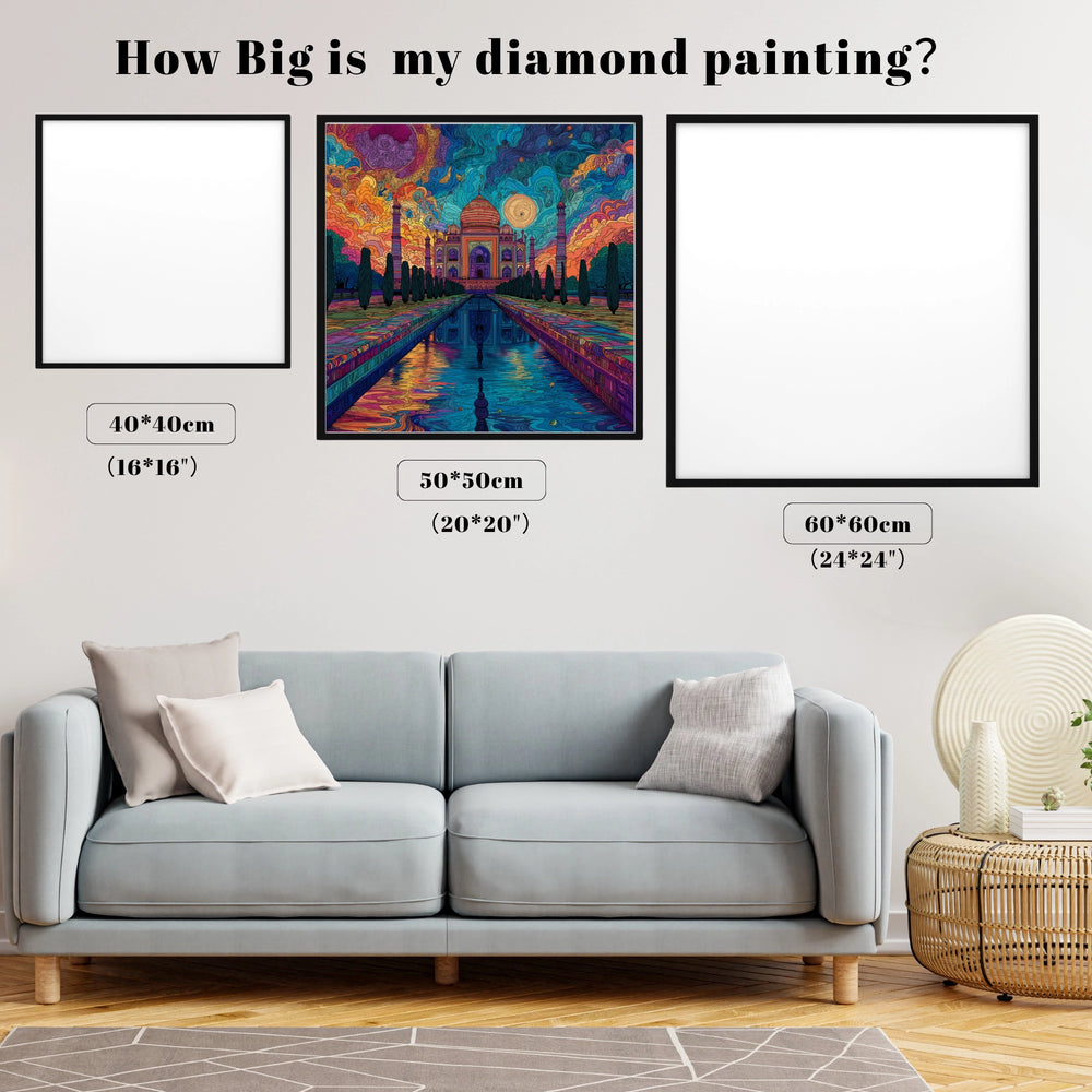 This design is a mesmerizing journey into a vibrant dreamscape. The iconic Taj Mahal stands beneath a swirling, kaleidoscopic sky, perfectly mirrored in the stylized reflecting pool. The stunning pinks, blues, and oranges evoke love and wonder. This captivating project lets you create a masterpiece that captures the magic of a timeless monument through a vivid, fantastical lens.