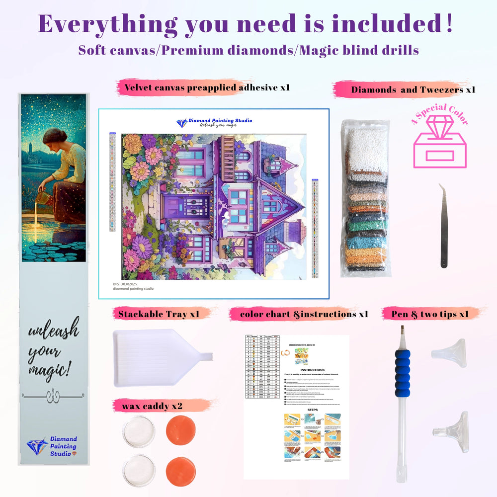 This design is a magical vision of whimsy and bloom. The beautiful Victorian home is painted in dreamy purples and pinks, surrounded by an explosion of oversized, vibrant garden flowers. It evokes pure fantasy and joy. This intricate project lets you create a masterpiece that captures the cheerful, enchanting spirit of a fairy-tale summer.