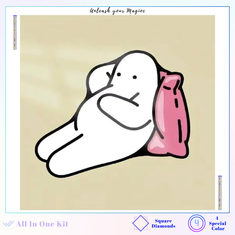This relaxing diamond painting kit shows a charming cartoon figure lounging with a pink pillow, crafted with premium resin drills, perfect for colorful wall decor and cozy DIY diamond art sessions.