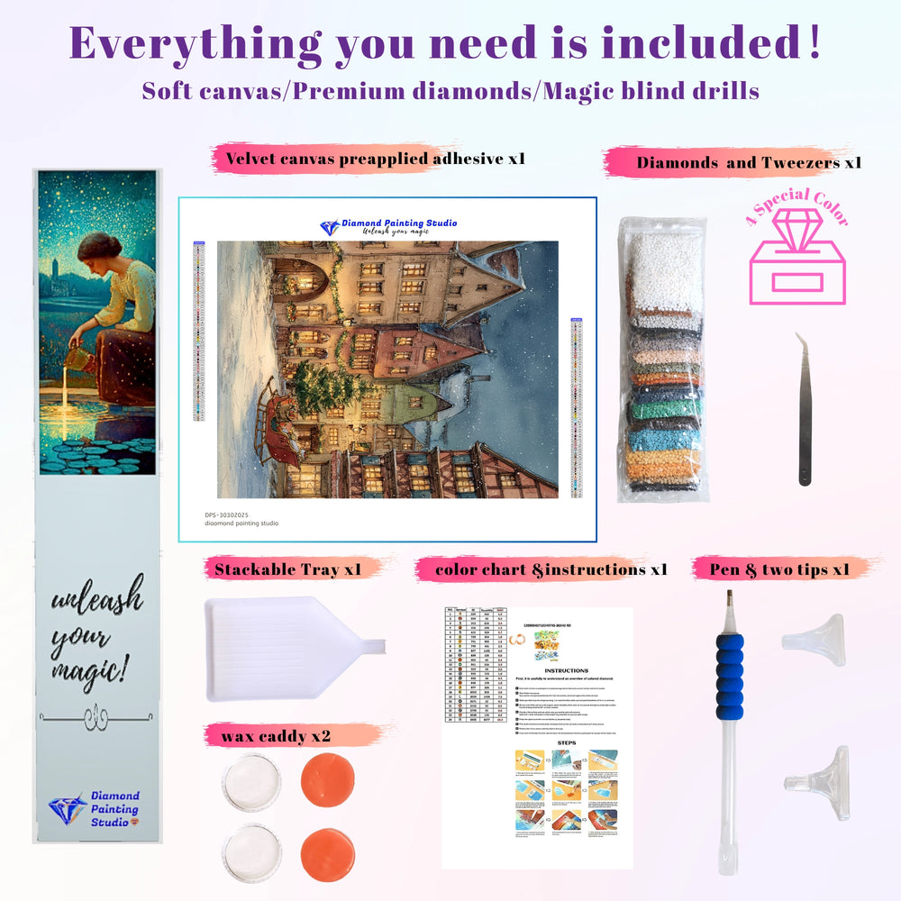 This design captures the heartwarming charm of a European Christmas market. A festive sleigh, filled with gifts, rests by a brightly lit tree amidst cozy, half-timbered houses dusted with snow. It evokes deep holiday nostalgia and romance. This intricate project lets you create a masterpiece that celebrates the warmth, community, and quiet magic of a perfect Christmas Eve.
