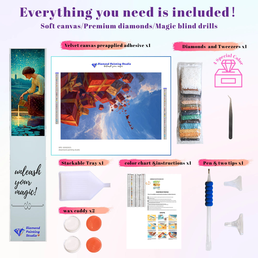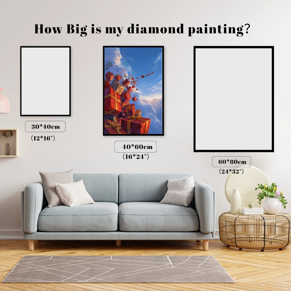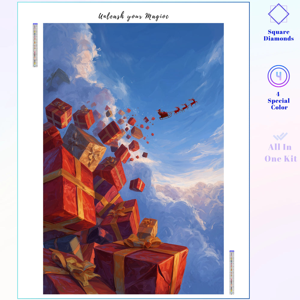 This design captures the thrilling urgency of Christmas morning delivery. Giant, brightly wrapped gifts tumble through the sky as Santa's sleigh flies high above the clouds. It evokes the excitement, generosity, and sheer magic of the festive season. This dynamic project lets you create a masterpiece that celebrates the joy of giving and the limitless wonder of Christmas Eve.