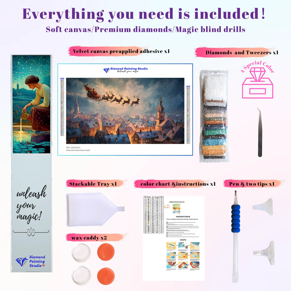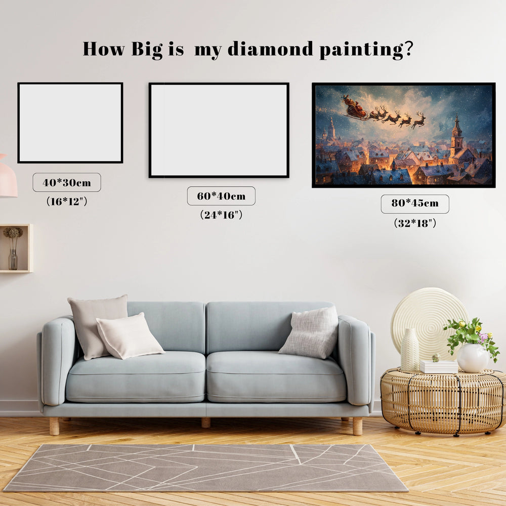 This design captures the epic, magical moment of Christmas Eve. Santa’s sleigh, pulled by flying reindeer, soars over a snowy, warmly lit European village under a dark, dramatic sky. It evokes pure wonder and festive anticipation. This grand, immersive project lets you create a masterpiece that celebrates the boundless magic and joy of the holiday season.