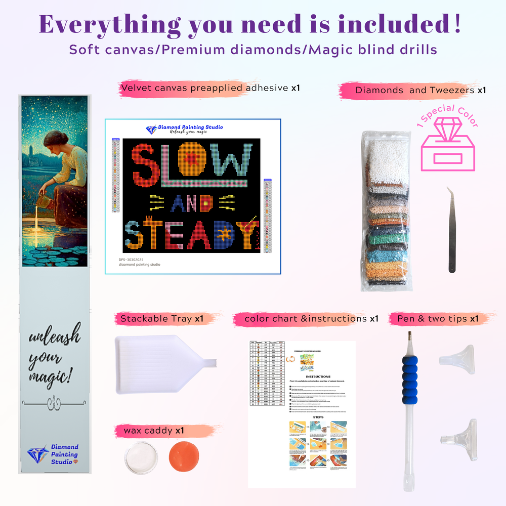 This design is a colorful mantra for modern life. The bright, pixelated "SLOW AND STEADY" message reminds you that the journey is the reward. Hidden details—like the martini glass and crown—add a touch of playful self-care. This fun, mindful project encourages a patient pace, perfectly reflecting the quiet joy of creation. Finish it to celebrate your commitment to calm.