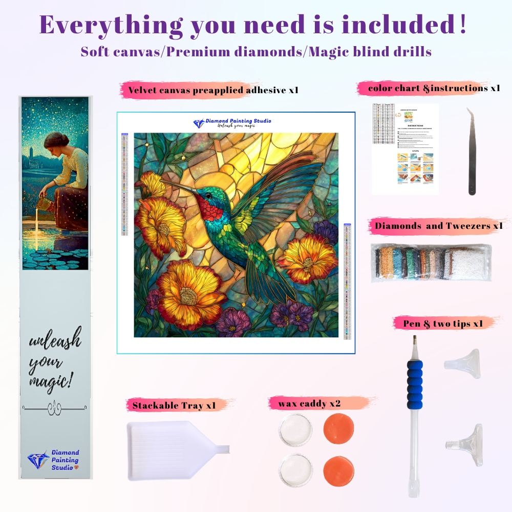 This design captures the dazzling vitality of nature. The tiny Hummingbird, a symbol of joy and resilience, hovers amidst vibrant flowers, its feathers shimmering like stained glass jewels. The warm golden light emphasizes the magic of the moment. This complex, therapeutic project invites deep focus, allowing you to create a beautiful, radiant piece that reminds you to cherish every fleeting, precious moment.