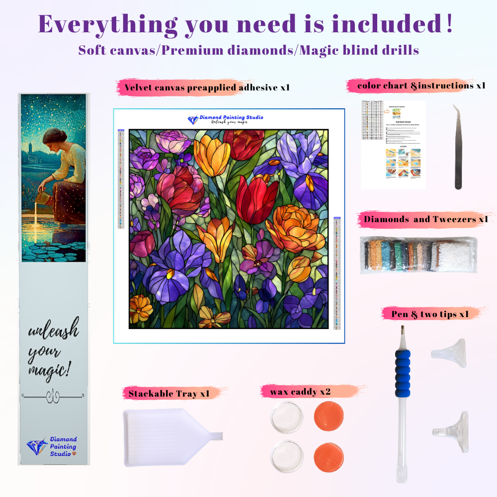 This design is a breathtaking celebration of spring's glory. The garden explodes with tulips, irises, and lilies, all rendered in deep, saturated jewel tones. The luminous stained-glass style captures pure, untamed vitality. This complex, therapeutic project invites focused calm, allowing you to create a vibrant, beautiful window of healing light and eternal spring for your home.