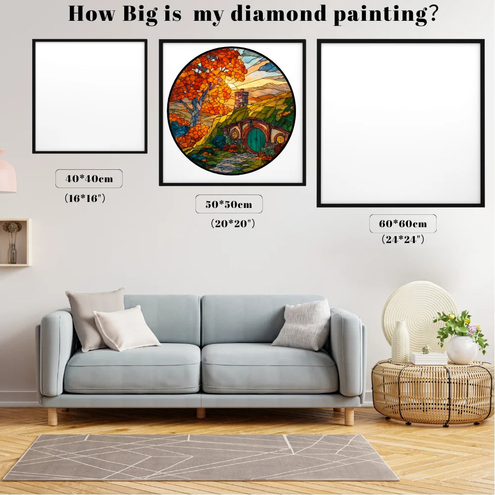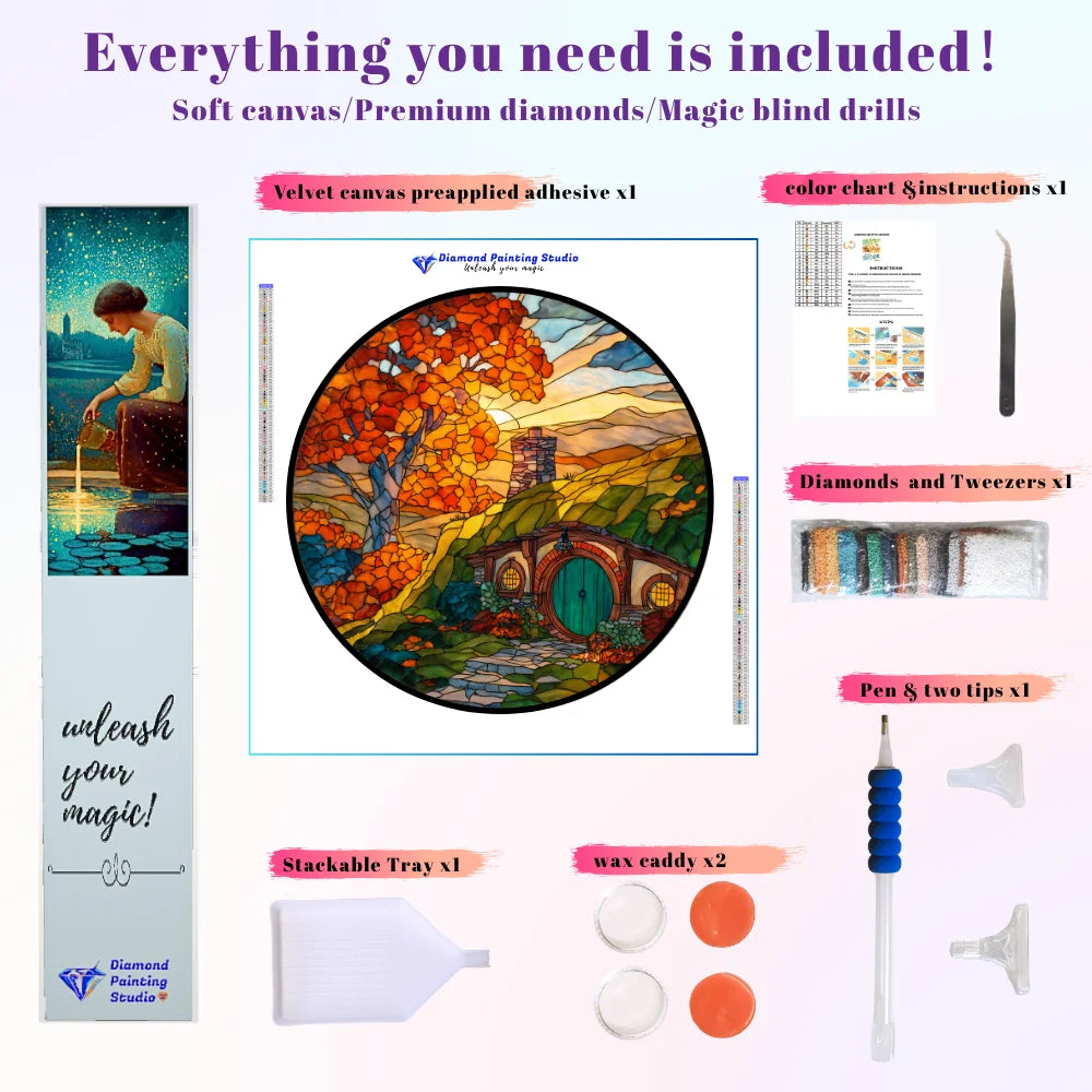 This design captures the enchanting comfort of a cozy, fantastical home. The hillside dwelling, framed by an autumn tree, glows with the warmth of sunset. The entire scene is rendered in rich, luminous stained glass. This magical, therapeutic project invites deep peace and reflection, allowing you to create a window into a simpler, more beautiful world for your own sanctuary.