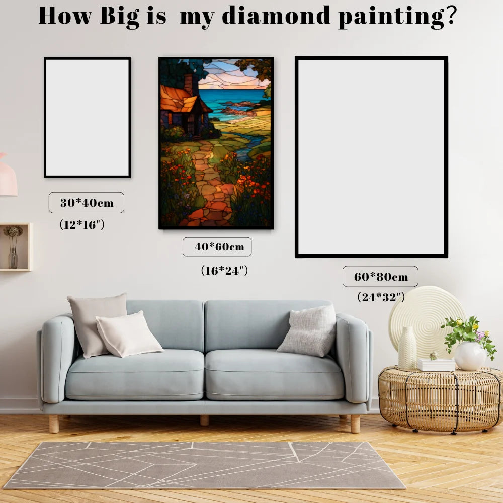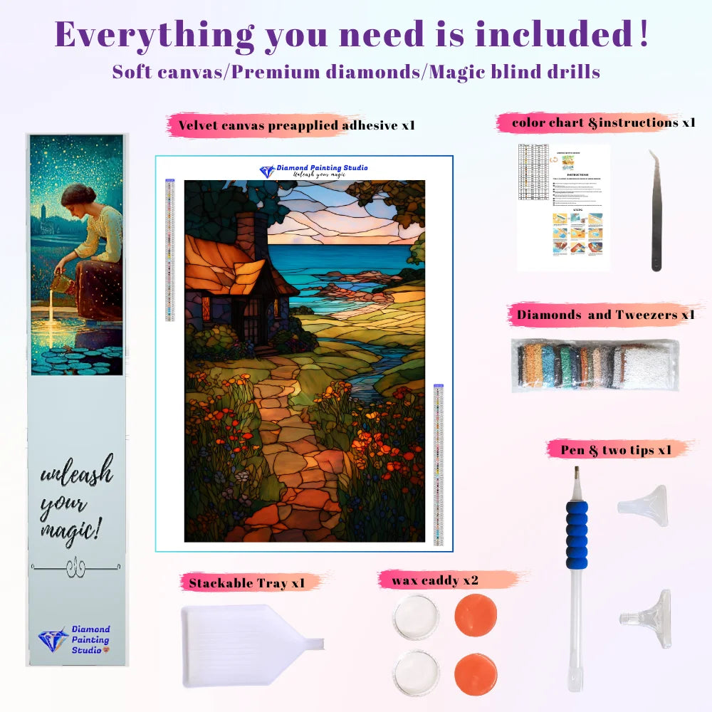 This design captures the warmth of coming home. The cozy cottage sits above a serene coastline, framed by a welcoming path and blooming flowers. Rendered in stunning stained glass, the piece glows with sunset colors. This intricate project invites deep relaxation and nostalgic calm, allowing you to create a beautiful, tranquil sanctuary for your own wall.