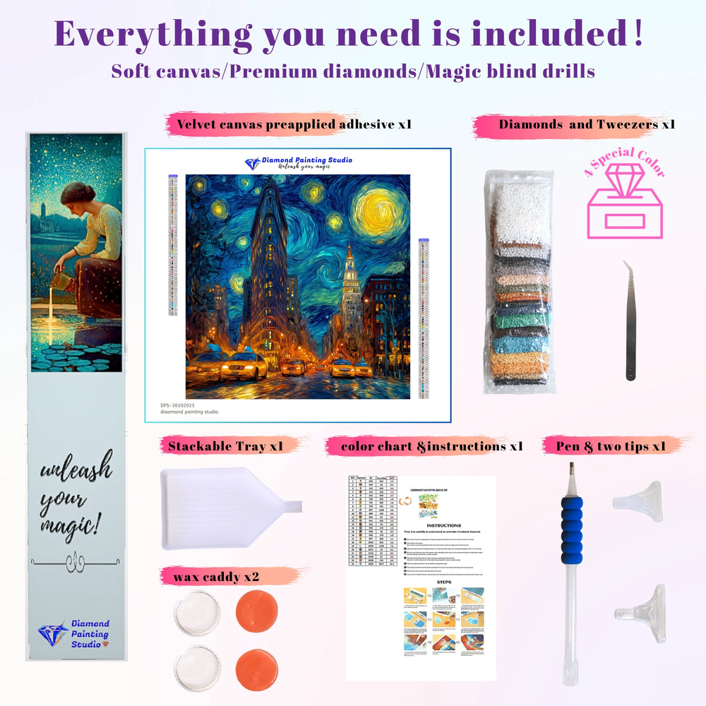 This design merges the drama of Van Gogh's sky with the majesty of the New York City skyline. The iconic Flatiron Building soars beneath a swirling, star-filled night, while taxis glow with warm, hurried life. It captures both the chaos and the magic of the metropolis. This immersive project lets you create a masterpiece that celebrates urban energy and boundless dreams.