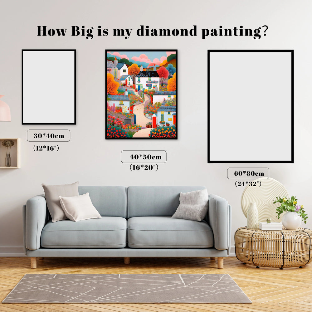 This design is a charming cascade of color and comfort. White cottages cluster on a hillside, connected by a winding path, and framed by trees in fiery autumn colors. The scene is saturated with vibrant blooms and playful contrasts. This delightful project lets you create a masterpiece that captures the cheerful, comforting magic of a secret, sunlit village.