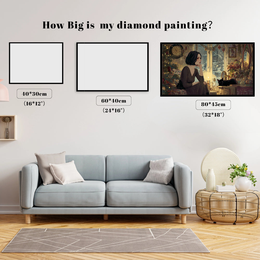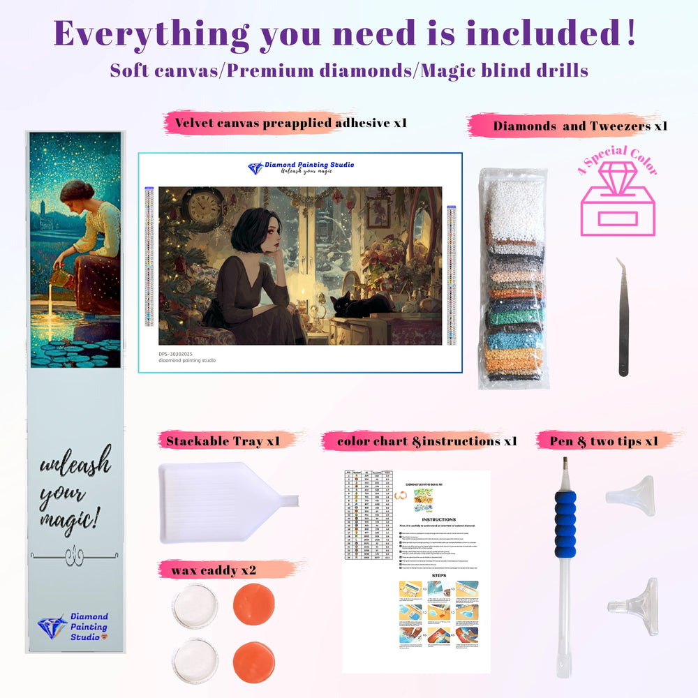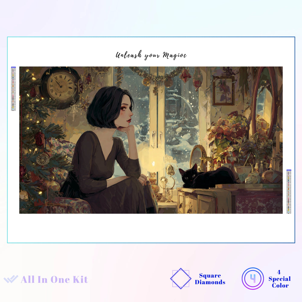 This design captures the intimate tranquility of the winter holidays. A contemplative woman watches the snow fall, sharing a quiet moment with her black cat amidst twinkling Christmas decorations. The warm light evokes nostalgic peace and comfort. This immersive project lets you create a masterpiece that celebrates the calm, cozy magic of home during the festive season.